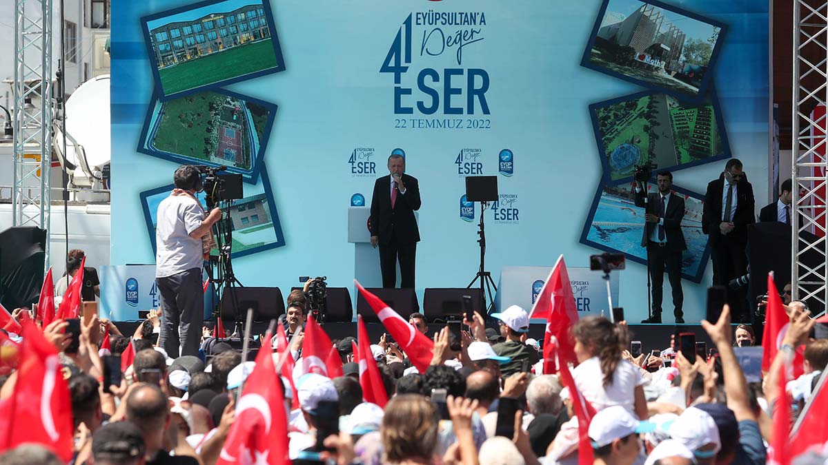 Erdoğan, Eyüpsultan Meydanı’nda düzenlenen 41 Ayda 41 Eser Toplu Açılış Töreni’ne katıldı. Erdoğan tören öncesi cuma namazını da Eyüpsultan Camii’nde kıldı. Erdoğan,. “Dünyamız salgınla başlayıp savaşta süren enerji ve gıda kriziyle tırmanan, iklim değişikliği gibi tehditlerle dallanıp budaklanan bir dönemden geçiyor. Türkiye sıkıntılı bu dönemin her aşamasında kendi vatandaşlarını en iyi şekilde korudu.
