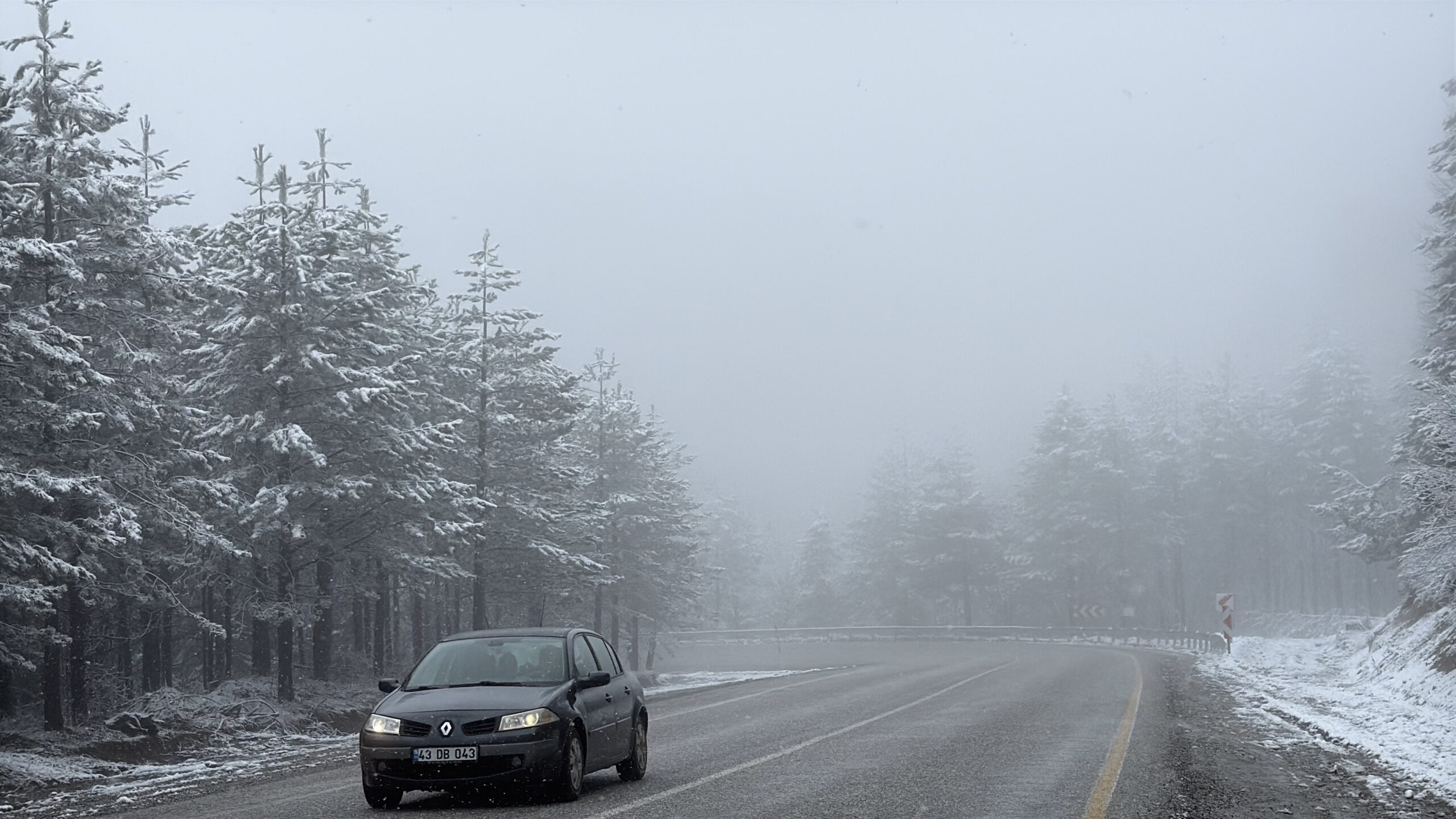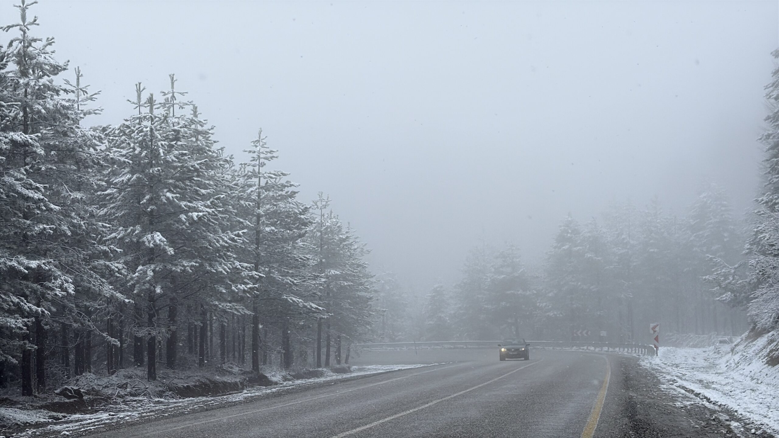 Kütahya'nın Domaniç ilçesi ile Bursa'nın İnegöl ilçesini birbirine bağlayan kara yolunda etkili olan kar yağışı ve sis nedeniyle araçlar düşük hızda ilerledi.