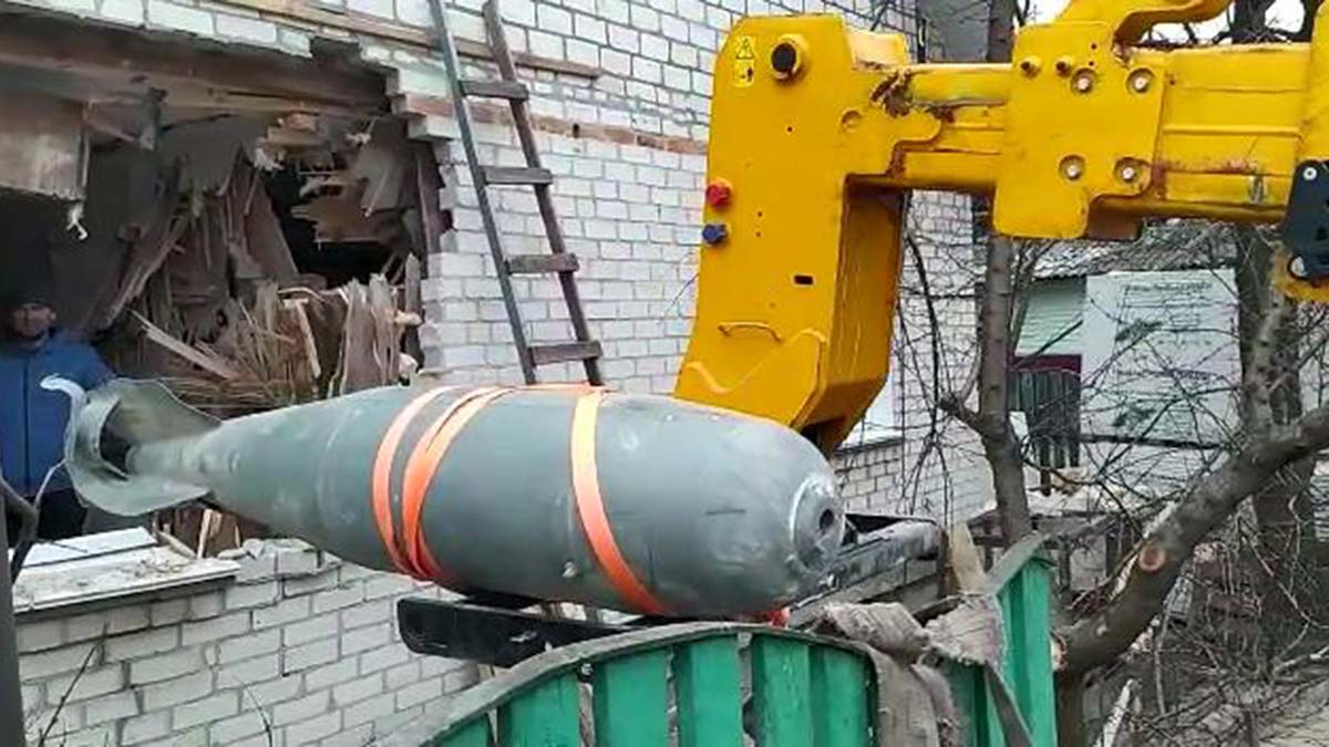 Ukrayna’nın Çernihiv kentinde bir eve düşen ve infilak etmeyen bomba, acil servis ekipleri tarafından çıkarıldı.