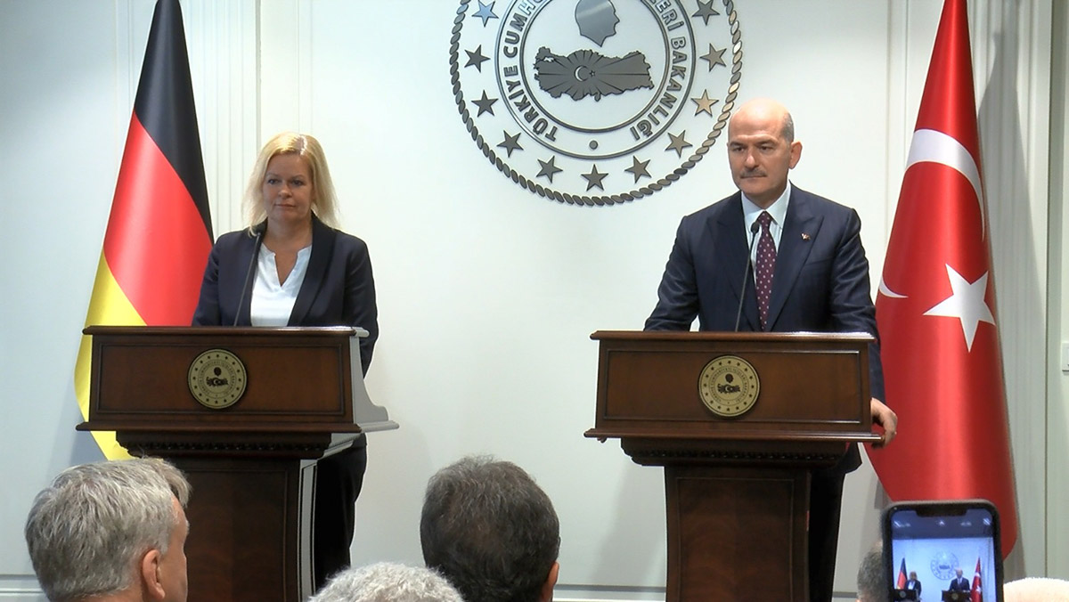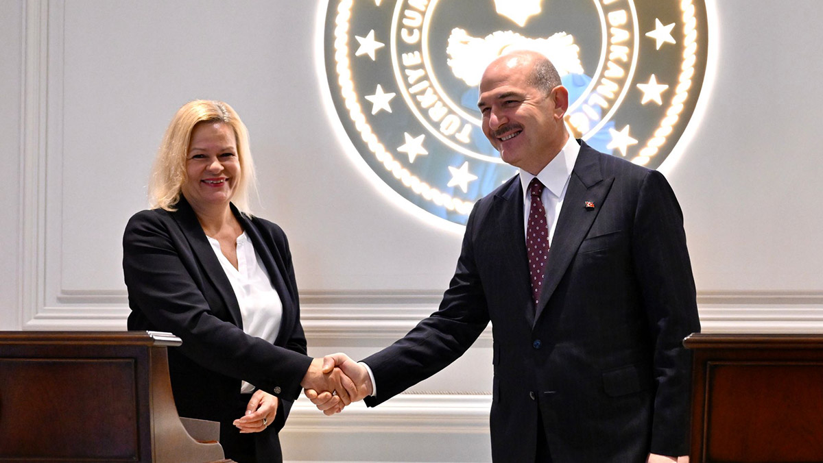 İçişleri Bakanı Süleyman Soylu, Türkiye’ye resmi ziyarette bulunan Almanya İçişleri Bakanı Nancy Faeser ile bakanlıkta bir araya geldi. Bakan Soylu ve Faeser, ikili görüşmenin ardından Güvenlik ve Acil Durumlar Koordinasyon Merkezi’nde (GAMER) heyetler arası görüşme yaptı. Soylu ve Faeser, görüşmenin ardından ortak basın toplantısı yaptı.