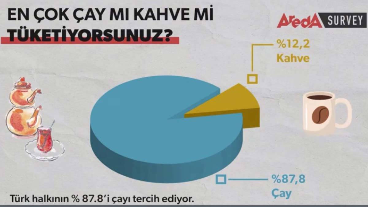 Areda Survey tarafından 19- 22 Kasım tarihleri arasında bin 100 kişi ile gerçekleştirilen “Çay mı kahve mi?” araştırması Türkiye’nin içecek seçimini masaya yatırdı. Araştırmaya göre, Türk halkının çayı kahveye tercih ettiği belirtildi. Kantitatif araştırma yöntemlerinden CAWI (Computer Aided Web Interviewing) ile gerçekleştirilen araştırmada kimilerinin içmekten büyük keyif aldığı kimilerinin ise ihtiyaç olarak gördüğü bu içecekler karşılaştırıldı.