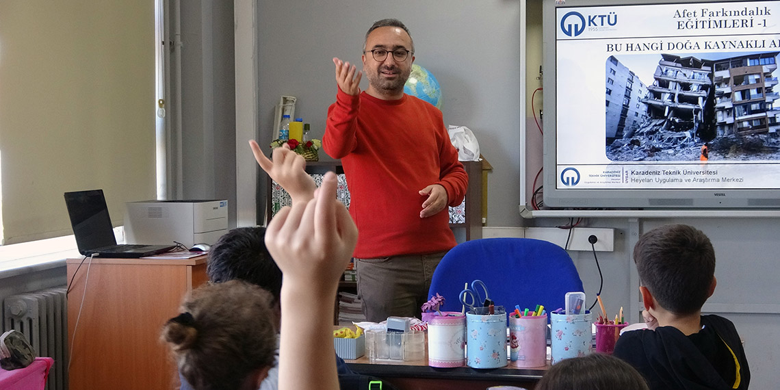 Akçabat ilçesindeki Darıca İlköğretim Okulu’nda miniklere ders veren KTÜ Heyelan Uygulama ve Araştırma Merkezi’nden görevli Jeofizik Mühendisliği Bölümü Öğretim Üyesi Doç. Dr. Ali Erden Babacan, “Şehrimize faydamız olması için; geleceğimiz çocuklara afet farkındalığı kazandırmayı düşünerek yola çıktık. Bu kapsamda KTÜ ve Milli Eğitim Müdürlüğü arasında protokol imzalandı.
