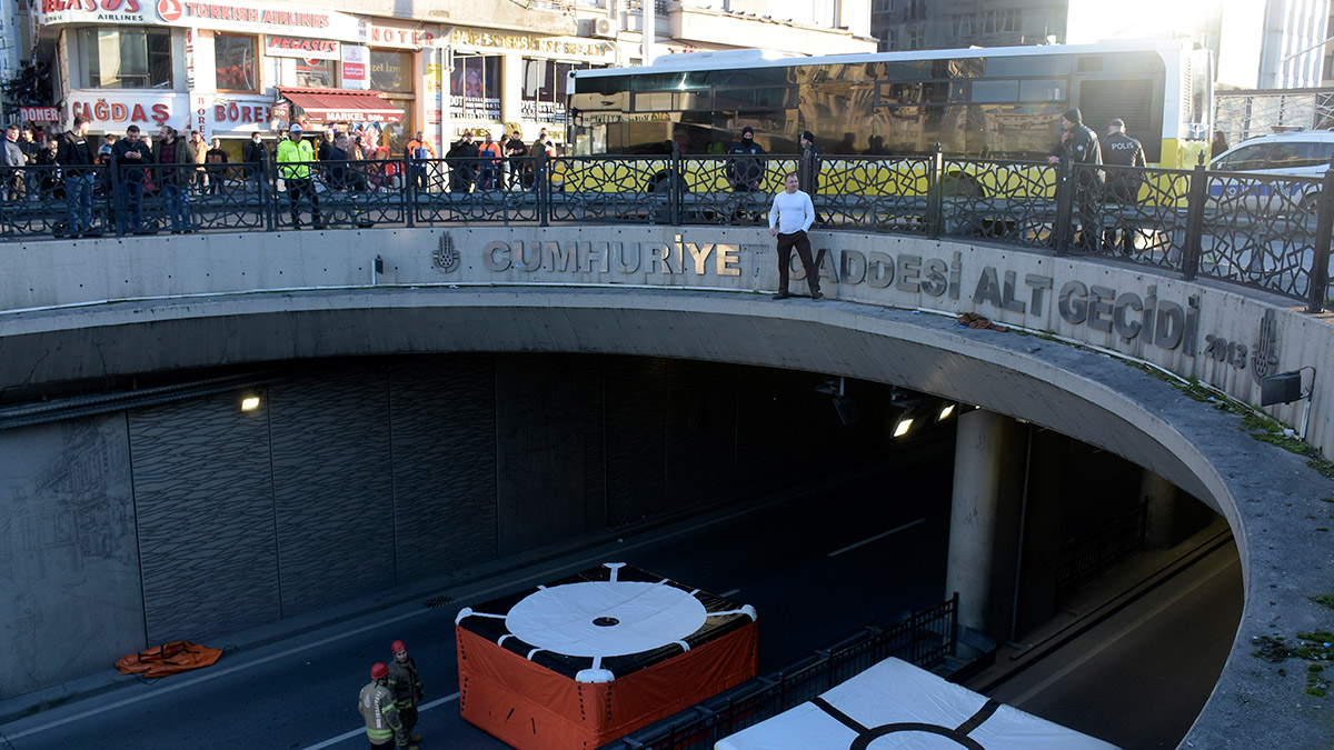 Olay, saat 06.00 sıralarında Taksim Cumhuriyet Caddesi alt geçidinde bariyerleri aşarak beton bölümün kenarına çıkan Ukraynalı A.A.I., Rusça ve İngilizce olarak ‘Ukrayna’da savaşa hayır’ şeklinde sloganlar attı. A.A.I., olayı görerek yanına gelen bir kişinin telefonunu istedi. Esnaftan telefonu alan A.A.I., sosyal medya üzerinden canlı yayın açarak slogan atmaya devam etti. Durumu fark eden polisin olay yerine geldiğini gören A.A.I., müdahale edilmesi halinde alt geçitten 4 metre aşağıdaki yola atlayacağını söyledi. Polis çevrede güvenlik önlemi alırken olay yerine itfaiye ve sağlık ekipleri sevk edildi. Tünel her iki yönden de trafiğe kapatılırken, itfaiye tedbir amacıyla şişme yatak açtı.