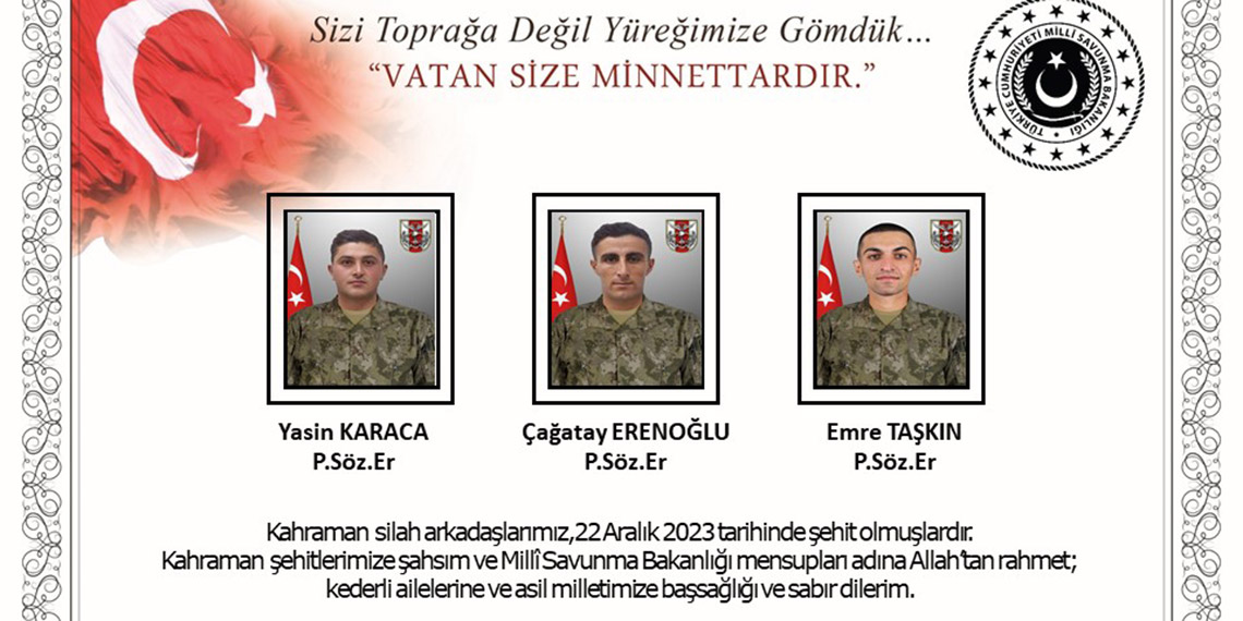 Milli Savunma Bakan Yaşar Güler, sosyal medya hesabından yapılan açıklamada, “Piyade Teğmen Ramazan Günay, Piyade Uzman Çavuş Mehmet Serinkan, Piyade Uzman Onbaşı İsmail Yazıcı, Piyade Sözleşmeli Er Yasin Karaca, Piyade Sözleşmeli Er Çağatay Erenoğlu ve Piyade Sözleşmeli Er Emre Taşın. Kahraman silah arkadaşlarımız 22 Aralık 2023 tarihinde şehit olmuşlardır. Kahraman şehitlerimize şahsım ve Milli Savunma Bakanlığı mensupları adına Allah’tan rahmet, kederli ailelerine ve asil milletimize başsağlığı ve sabırlar dilerim” dedi.