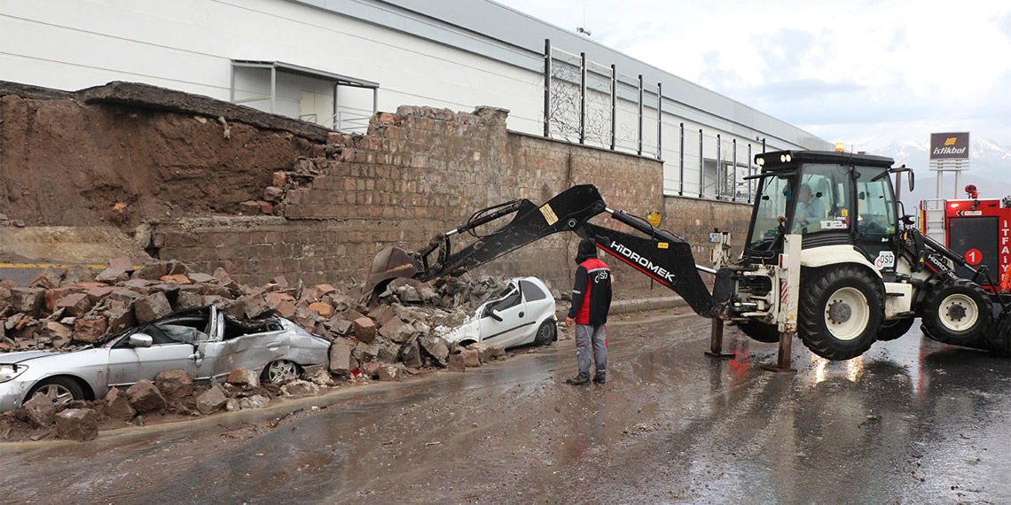 Kayseri’de sağanak nedeniyle bir iş yerinin istinat duvarı çöktü. Park halindeki 3 araç, çöken duvarın altında kalarak, kullanılamaz hale geldi.