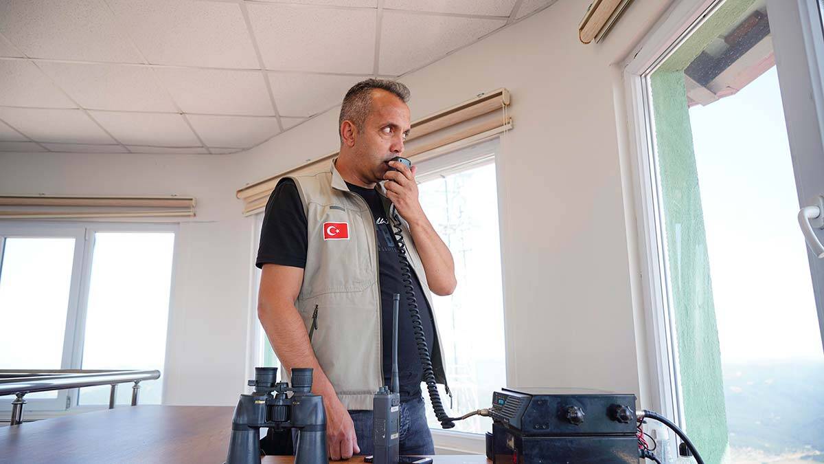 4 il ve 11 orman işletme müdürlüğünün bağlı olduğu Işıkdağı Yangın Gözetleme Kulesi’nde saat başı denetim yapılıyor
