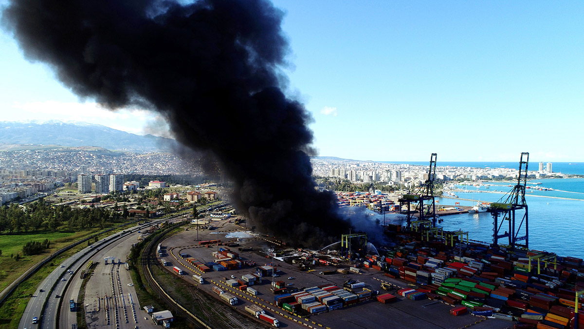 İskenderun Limanı’ndaki yangına Tarım ve Orman Bakanlığı’nın Beriev yangın söndürme uçağı, T79 yangın söndürme helikopteri ve itfaiye ekiplerinin müdahalesi sürüyor.