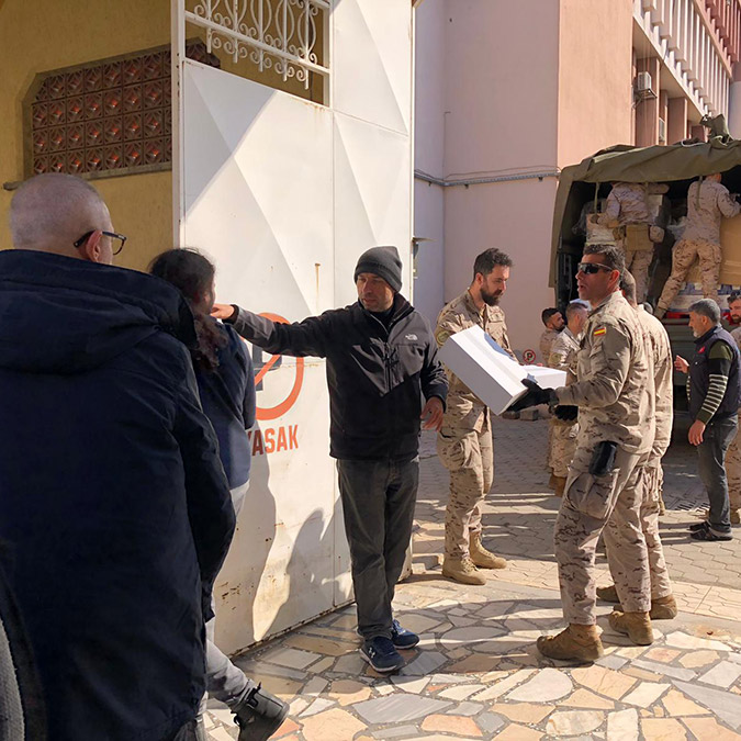 Kahramanmaraş merkezli depremin vurduğu Hatay’ın İskenderun ilçesine gemiyle gelen İspanyol askerler, depremde yıkılan 152 yıllık Latin Katolik Kilisesi’ne insani yardım taşıdı.