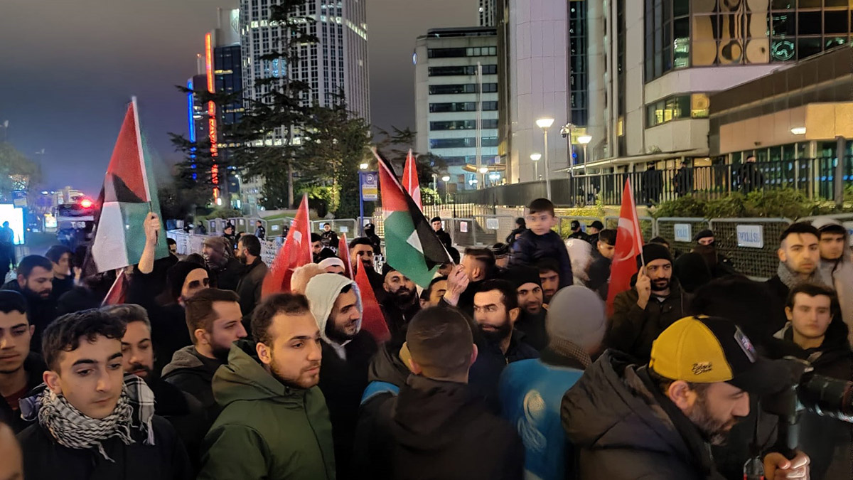 Beşiktaş’taki İsrail Başkonsolosluğu önünde toplanan yüzlerce kişi, İsrail güçlerinin Mescid-i Aksa’ya yaptığı baskını protesto etti. Ellerinde Türk ve Filistin bayrakları taşıyarak, çeşitli dövizler açan grup, sloganlar attı. Polis gösteri sırasında konsolosluk çevresinde güvenlik önlemi aldı.