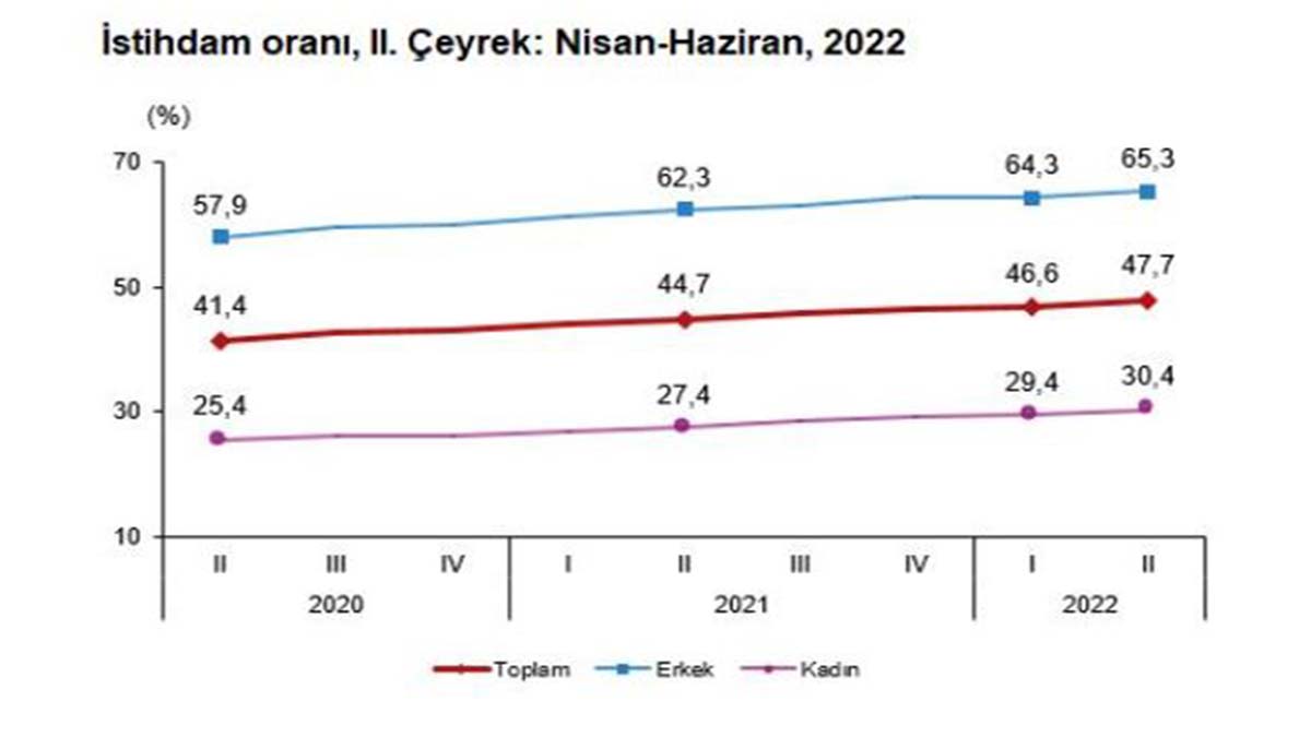TÜİK’ten yapılan açıklamaya göre; 15 ve daha yukarı yaştaki kişilerde işsiz sayısı 2022 yılı 2’nci çeyreğinde bir önceki çeyreğe göre 43 bin kişi azalarak, 3 milyon 654 bin kişi oldu. İşsizlik oranı ise 0,4 puanlık azalış ile yüzde 10,6 seviyesinde gerçekleşti. İşsizlik oranı erkeklerde yüzde 8,9 iken; kadınlarda yüzde 13,9 olarak tahmin edildi. İstihdam edilenlerin sayısı 765 bin kişi artarak 30 milyon 775 bin kişi, istihdam oranı ise 1,1 puanlık artış ile yüzde 47,7 oldu. Bu oran erkeklerde yüzde 65,3 iken; kadınlarda yüzde 30,4 olarak gerçekleşti.