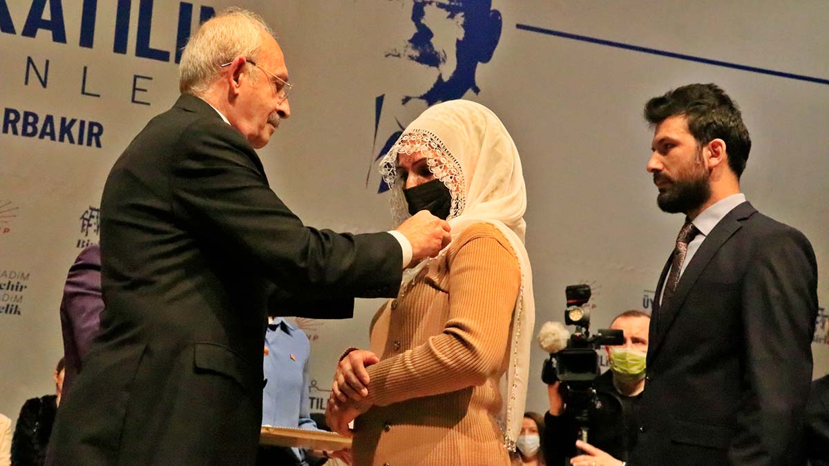 CHP Genel Başkanı Kemal Kılıçdaroğlu, Sezai Karakoç Kültür ve Kongre Merkezi’nde partisine katılan bin 300 kişiyle bir araya gelerek, rozet taktı. Kılıçdaroğlu, CHP’nin Diyarbakır’da fazla oyunun olmadığını belirterek, “Oy istiyorsan, gideceksin. Vatandaşın derdini dinleyeceksin. Sofrasında oturacaksın, çayını içeceksin, derdini dinleyeceksin, ondan sonra da diyeceksin ki; sizin dertlerinizi çözmeye talibim. Buraya geldim, sizin dertlerinize talibim. Sizin dertlerinizi çözeceğim, beraber çözeceğiz.