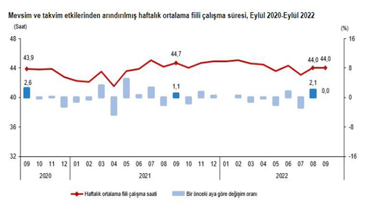 İstihdam edilenlerden referans döneminde işbaşında olanların, mevsim ve takvim etkilerinden arındırılmış haftalık ortalama fiili çalışma süresi, değişim göstermeyerek 44 saat olarak gerçekleşti.