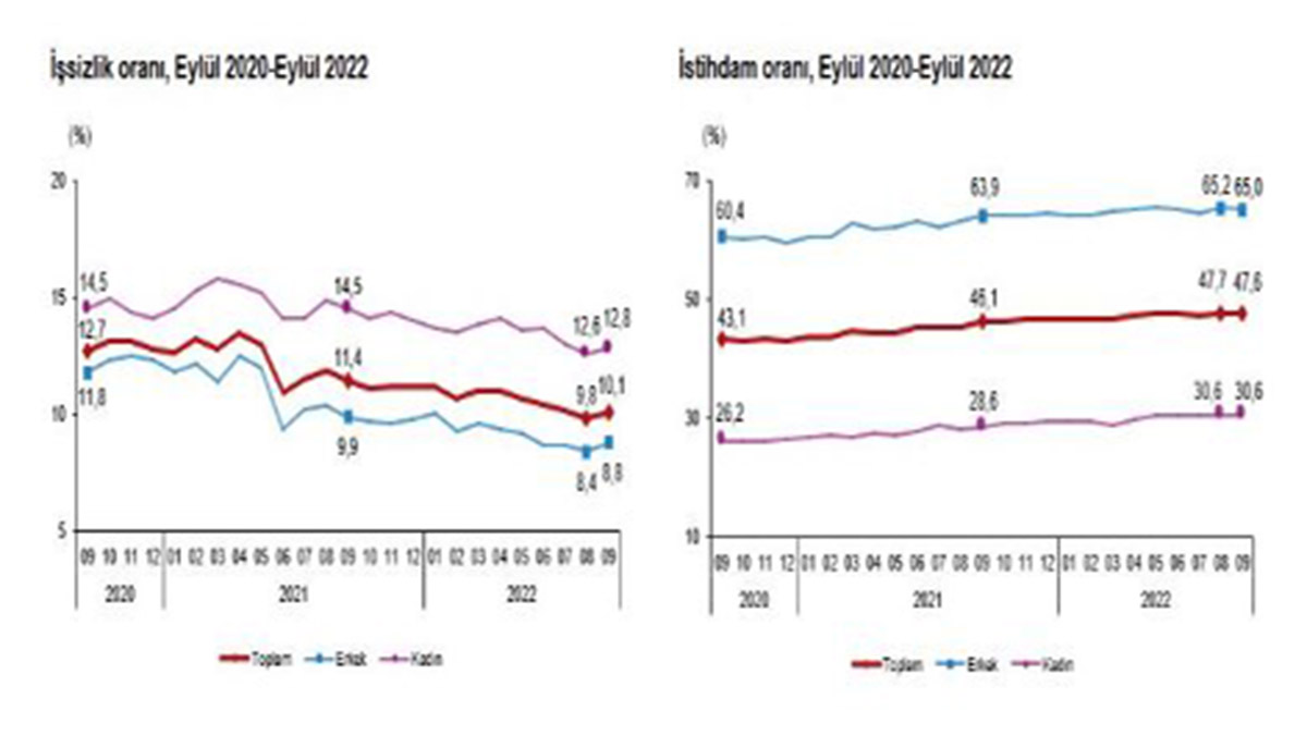 TÜİK’ten yapılan açıklamaya göre; 15 ve daha yukarı yaştaki kişilerde işsiz sayısı, 2022 Eylül’ünde bir önceki aya göre 120 bin kişi artarak 3 milyon 482 bin kişi oldu. İşsizlik oranı ise 0,3 puanlık artışla yüzde 10,1 seviyesinde gerçekleşti. İşsizlik oranı erkeklerde yüzde 8,8, kadınlarda yüzde 12,8 olarak değerlendirildi. İstihdam edilenlerin sayısı, önceki aya göre 54 bin kişi azalarak 30 milyon 867 bin kişi, istihdam oranı ise 0,1 puanlık azalış ile yüzde 47,6 oldu. İstihdam oranı, erkeklerde yüzde 65, kadınlarda yüzde 30,6 olarak gerçekleşti.