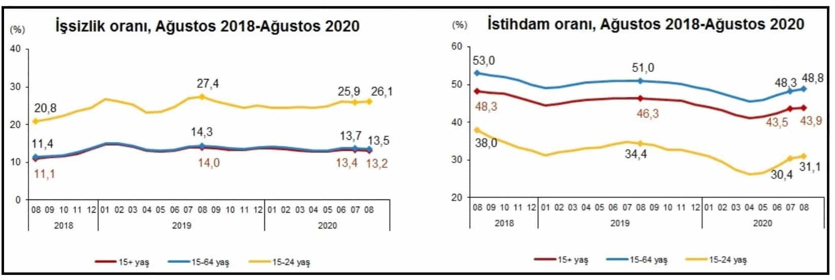 Türkiye genelinde işsizlik Temmuz, Ağustos, Eylül aylarını kapsayan Ağustos döneminde yüzde 13.2’ye, istihdam edilenler 975 bin kişi azalarak 27 milyon 554 bin kişiye, istihdam oranı da 2.4 puanlık azalış ile yüzde 43.9’a geriledi.