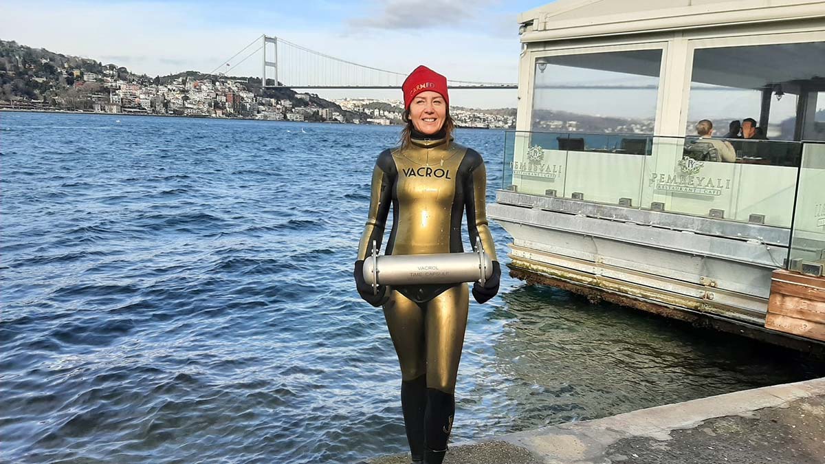 Serbest Dalış Dünya Rekortmeni Milli sporcu Birgül Erken, İstanbul Boğazı’nda 50 metreye tek nefeste tüpsüz serbest dalış yaparak rekor kırdı.