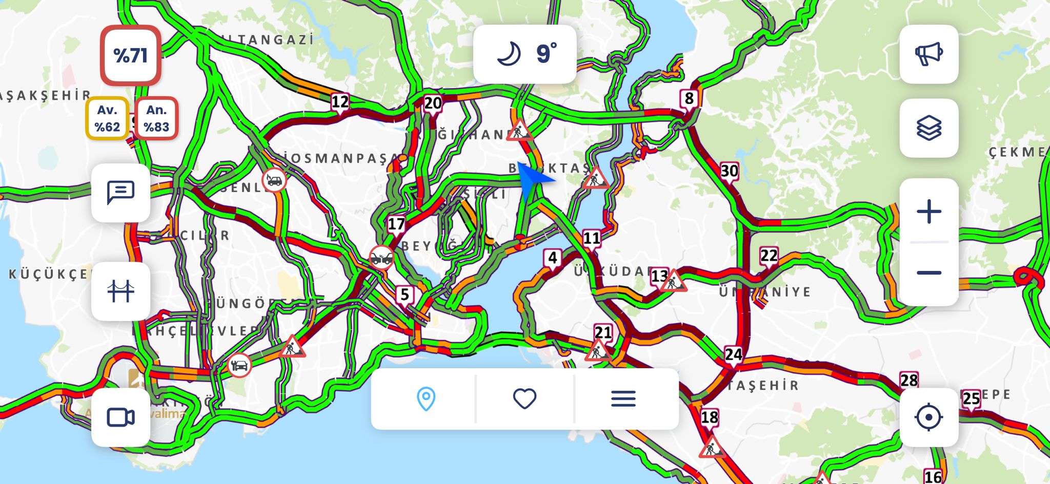 İstanbul’da haftanın ilk iş gününde trafik yoğunluğu yaşandı. İBB Trafik Yoğunluk Haritası verilerine göre saat 09.00 itibarıyla yoğunluk yüzde 71’e ulaştı.