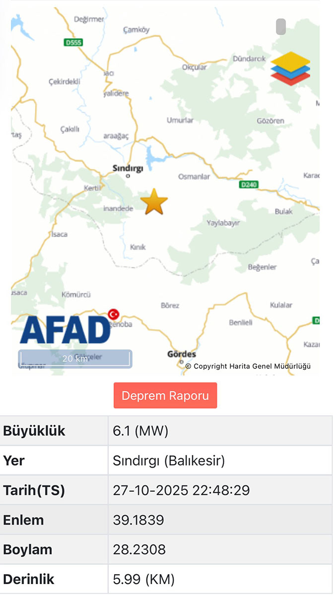 Afet ve Acil Durum Yönetimi Başkanlığı (AFAD) Deprem Dairesi verilerine göre, saat 22.48’de merkez üssü Balıkesir’in Sındırgı ilçesi olan 6.1 büyüklüğünde deprem oldu. Sarsıntı, yerin 5.99 kilometre derinliğinde meydana geldi. Deprem, Marmara ve Ege Bölgesi’nde de hissedildi. AFAD’ın sosyal medya hesabından yapılan açıklamada, “Balıkesir ilimizin Sındırgı ilçesinde, saat 22.48’de 6.1 büyüklüğünde bir deprem meydana geldi. Gelişmeleri takip etmekteyiz” denildi. Depremin ardından hissedilen bölgelerde vatandaşlar cadde ve sokaklara çıktı. Vatandaşlar üzerlerine sardıkları battaniyelerle ısınmaya çalıştı.
