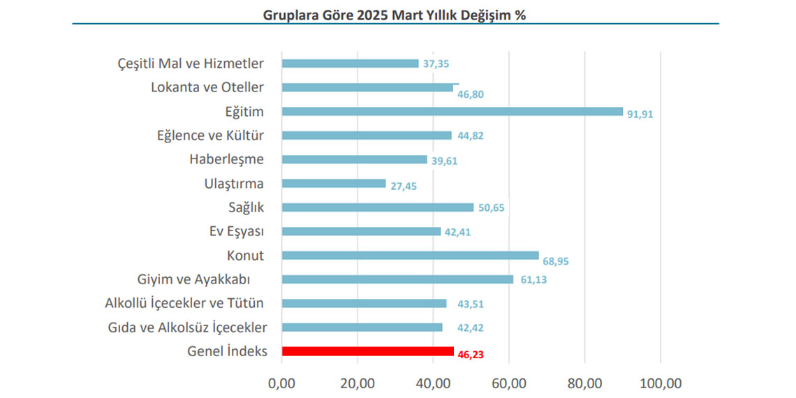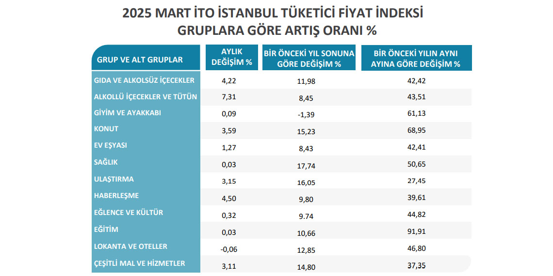 2025 Mart ayında en yüksek grup artışı yüzde 7,31 ile alkollü içecekler ve tütün harcamaları, en çok azalış 0,06 ile lokanta ve oteller harcama grubunda izlendi.