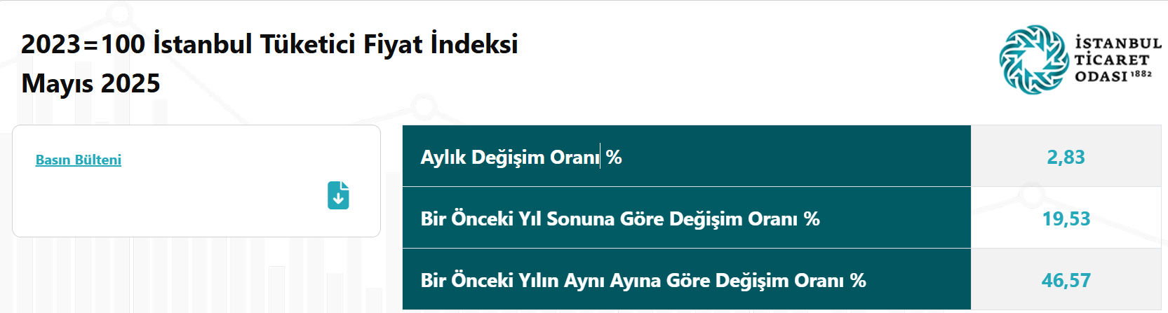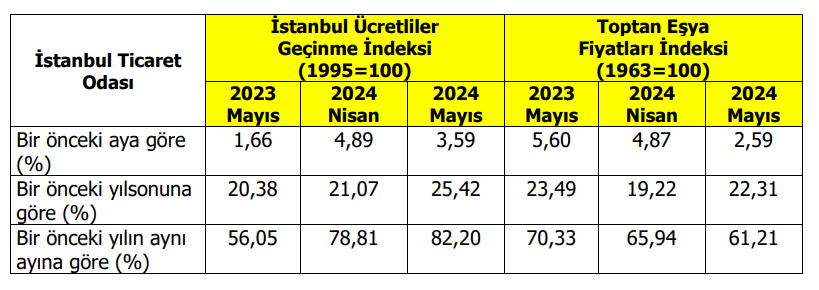 2023 Mayıs ayına göre 2024 Mayıs ayında yaşanan fiyat değişimlerini gösteren bir önceki yılın aynı ayına göre değişim oranı İstanbul Ticaret Odası’nın (İTO) 1995 bazlı Ücretliler Geçinme İndeksinde % 82,20, Toptan Eşya Fiyatları İndeksinde ise % 61,21 olarak gerçekleşmiştir.