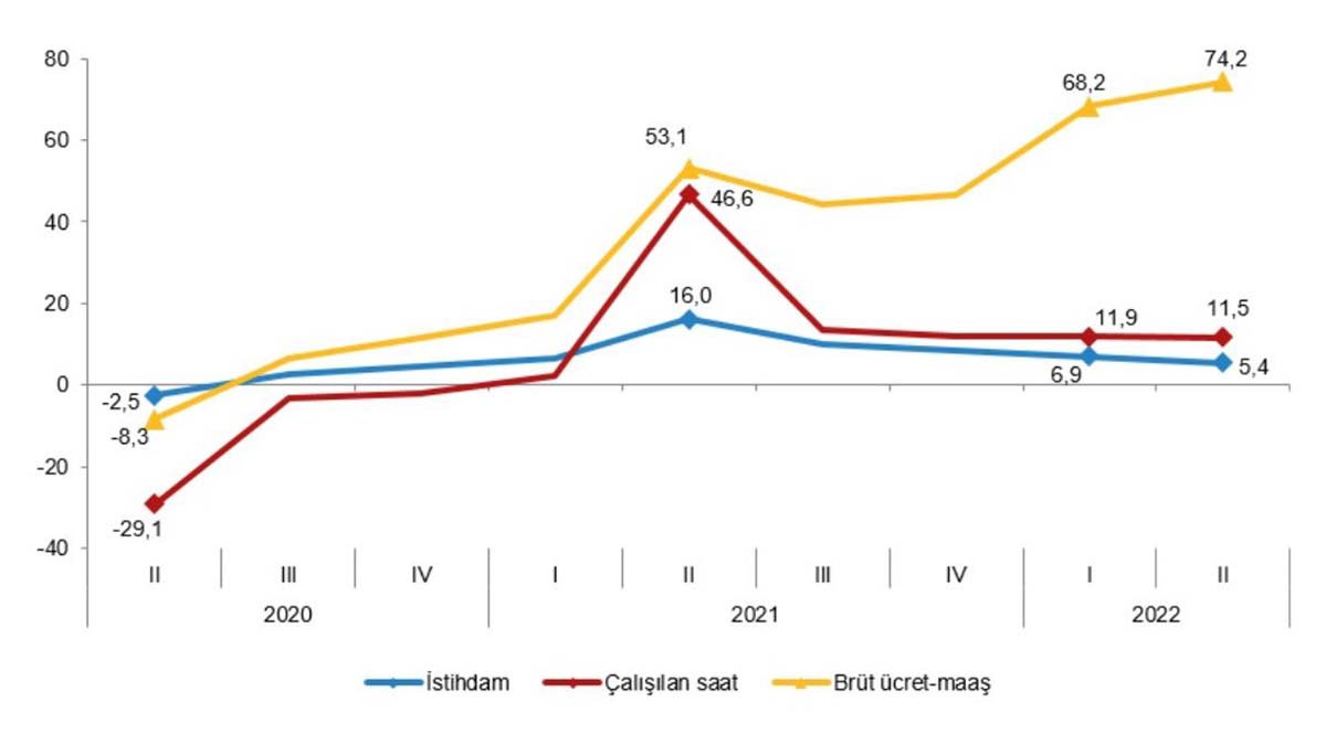 İstihdam endeksi, 2022’nin 1’inci çeyreğine göre yüzde 1,7 arttı. Alt sektörler incelendiğinde, sanayi sektöründe arttı 1,3 arttı, inşaat sektöründe yüzde 1,3 azaldı ve ticaret-hizmet sektörlerinde yüzde 2,5 arttı. Çalışılan saat endeksi yüzde 2,1 artarken sanayi sektöründe yüzde 1,2 arttı, inşaat sektöründe yüzde 0,2 azaldı ve ticaret-hizmet sektörlerinde yüzde 3,1 arttı. Brüt ücret-maaş endeksi, yüzde 12,4 arttı. Endeks; sanayi sektöründe yüzde 12,9, inşaat sektöründe yüzde 9,4 ve ticaret-hizmet sektörlerinde yüzde 12,4 arttı.