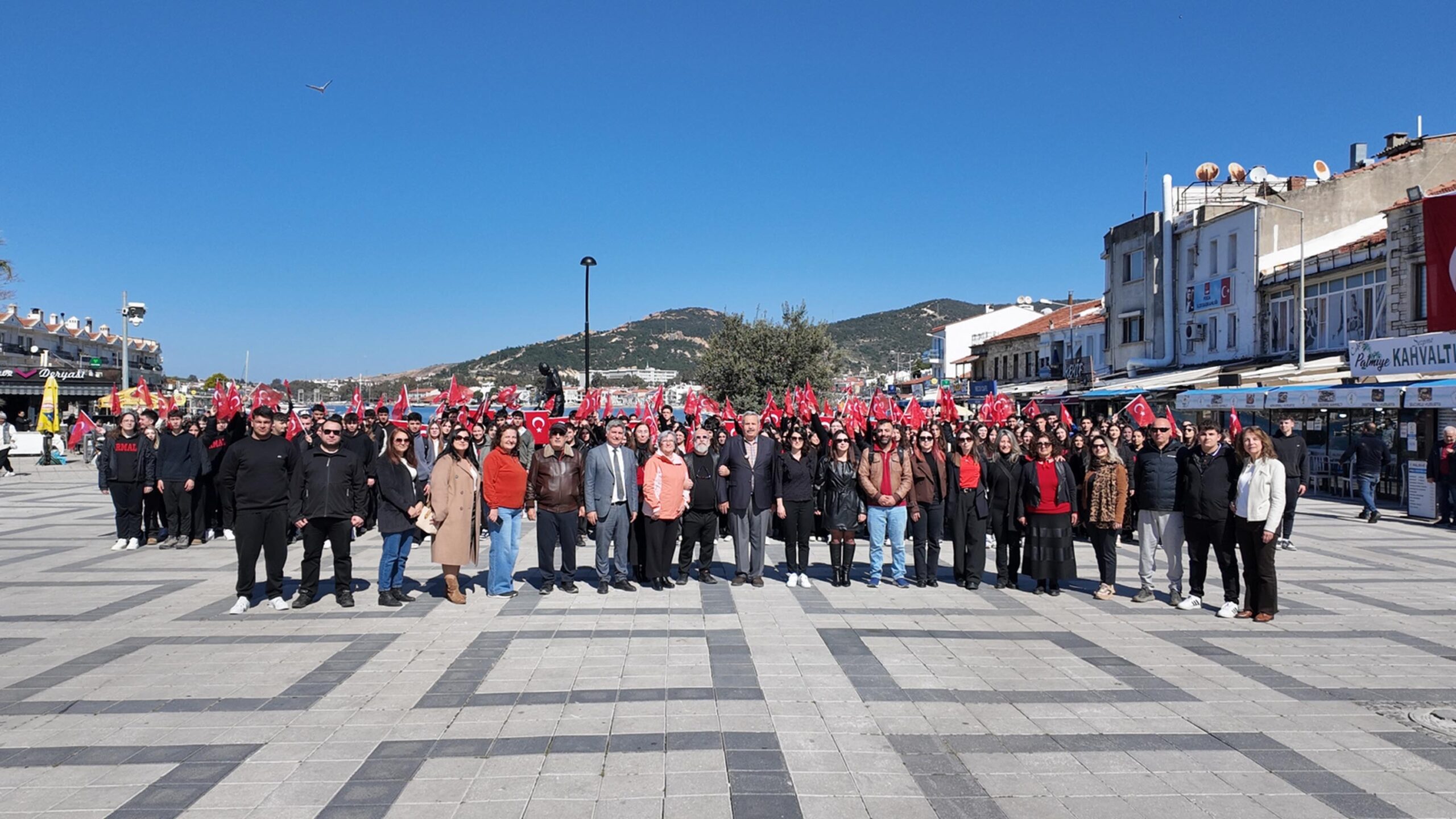İstiklal Marşı bu kez hep birlikte okundu. Okulun öğrencilerinden Ege Öztaş, "Okulumuz öğrencileri, Foça'nın çeşitli bölgelerinde İstiklal Marşı'mızın kıtalarını seslendirdik. Şimdi de Foça'mızın bu meydanındayız ve başta Ulu Önderimiz Atatürk ve İstiklal Marşı'mızın yazarı Mehmet Akif Ersoy'u saygı ve minnetle anıyoruz" dedi.