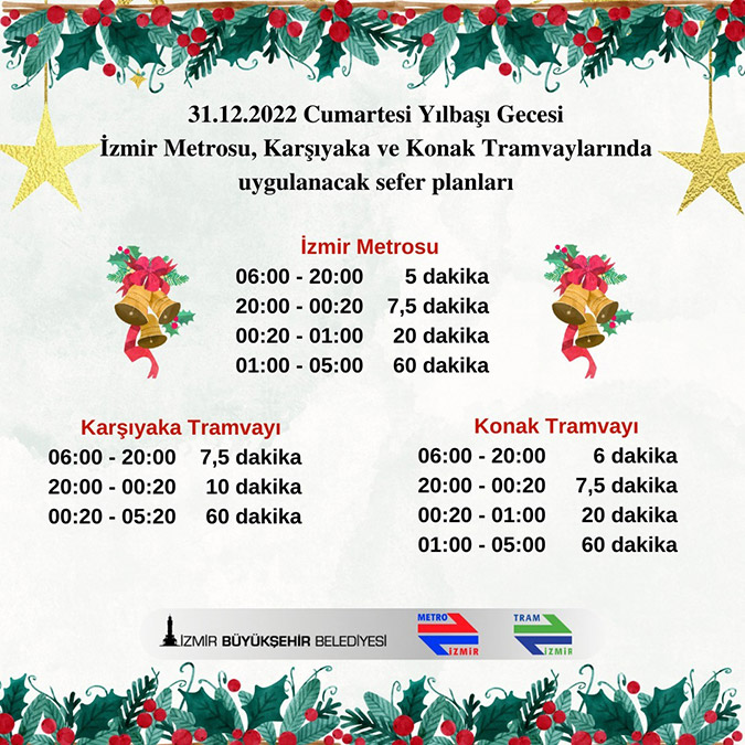 31 Aralık 2022 Cumartesi sabahı 06.00’da başlayan seferler 1 Ocak 2023 Pazar gece yarısına kadar normal programında devam edecek. Metroda ve Konak Tramvayı’nda 01.00-05.00 arasında; Karşıyaka Tramvayı’nda ise 00.20-05.20 arasında saat başı sefer yapılacak.