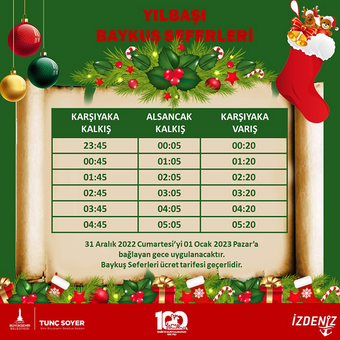İZDENİZ’e bağlı vapurlar 31 Aralık tarihinde her zaman uyguladığı haftasonu tarifesine göre hareket edecek. 31 Aralık’ı 1 Ocak’a bağlayan gece ise ihtiyaç halinde ek seferler uygulanacak. Alsancak –Karşıyaka arasında yapılan Baykuş seferleri saat 05.00’a kadar devam edecek. 01 Ocak 2021 Pazar günü ise yolcu gemileri ve arabalı vapurlar yine haftasonu tarifesine göre çalışacak. Bostanlı – Üçkuyular – Bostanlı hattında arabalı vapur seferleri 11.00’de başlayacak.