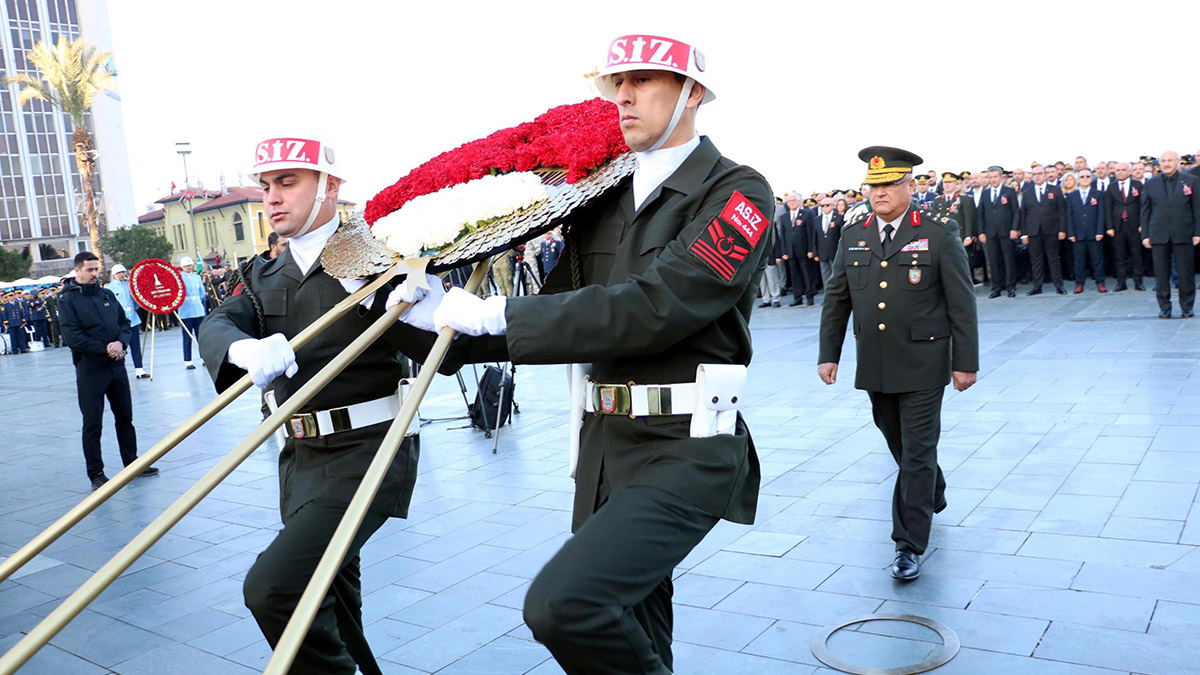 Törene İzmir Valisi Yavuz Selim Köşger, Ege Ordusu ve Garnizon Komutanı Korgeneral Kemal Yeni ve İzmir Büyükşehir Belediye Başkanı Tunç Soyer’in yanı sıra milletvekilleri, siyasi parti ve üniversite temsilcileri, bürokratlar ile sivil toplum kuruluşlarının temsilcileri katıldı. Vali Köşger, Korgeneral Yeni ve Başkan Soyer, Atatürk Anıtı’na çelenk bıraktı. Atatürk’ün hayatını kaybettiği saat olan 09.05’te 2 dakikalık saygı duruşunda bulunuldu, askeri bando eşliğinde İstiklal Marşı’nın okundu.