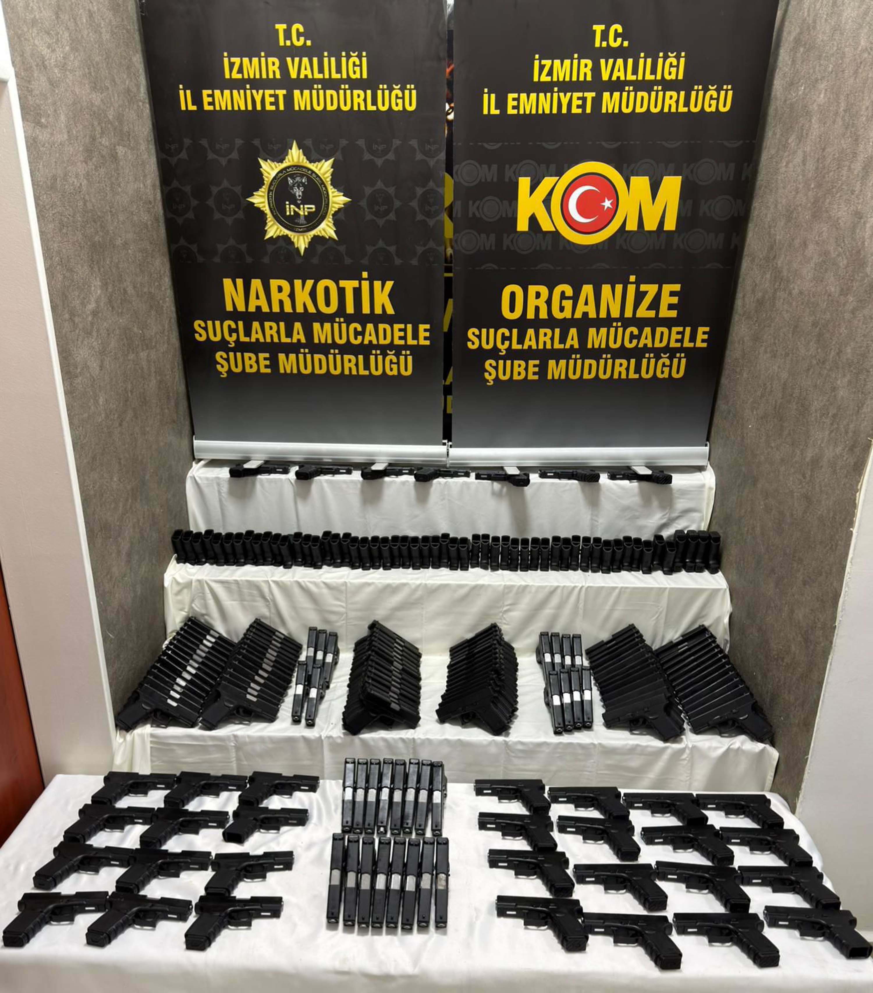 İzmir İl Emniyet Müdürlüğü'ne bağlı Narkotik Suçlarla Mücadele, Organize Suçlarla Mücadele ve İstihbarat Şube Müdürlüğü ekipleri, dün Karabağlar ilçesinde belirlenen adrese operasyon düzenledi. Operasyonda 149 ruhsatsız tabanca, 77 tabanca gövdesi, 38 icra yayı ve mili ile satışa hazır hale getirilmiş bir miktar esrar ele geçirildi. Olayla ilgili 2 şüpheli, gözaltına alındı. Şüphelilerin işlemleri sürüyor.