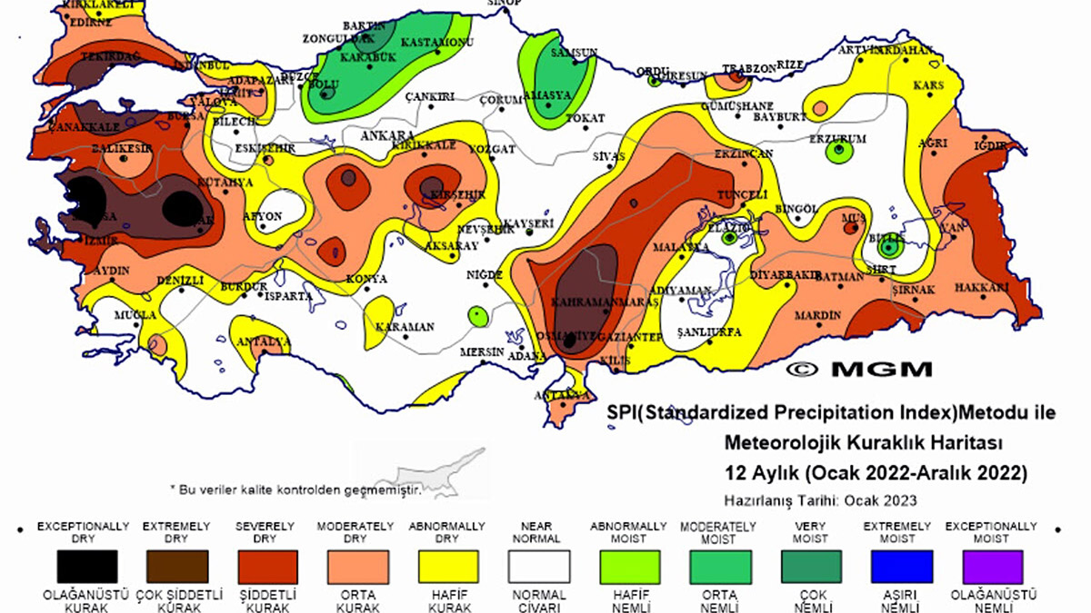 Çevre, Şehircilik ve İklim Değişikliği Bakanlığı Meteoroloji Genel Müdürlüğü Meteorolojik Kuraklık Haritası 12 aylık dönem verilerinde İzmir’in bir bölümünün ‘çok şiddetli kuraklık’, diğer bölümünün ise ‘şiddetli kuraklık’ yaşadığı gözlemlendi.
