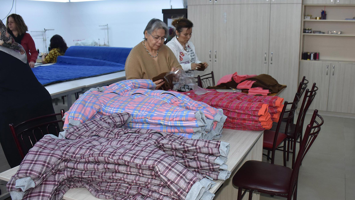 Bayraklı Halk Eğitim Merkezi’nde giyim öğretmeni İnci Bandaş ise “Bayraklı’da büyük bir deprem yaşadık. Birçok kursiyerim o depremden etkilendi. Deprem sonrasında, ‘Ne yapabiliriz, onları nasıl rehabilite edebiliriz?’ diye düşündük ve halk eğitim merkezimizde bu kursu hayata geçirdik. Onlar da kurslara devam ederek bir nebze olsun yaşadıklarını unutmaya çalıştılar. Son yaşanan Kahramanmaraş depreminden sonra da biz hemen deprem bölgesine giysi gönderilmesi için harekete geçtik. Eşofman, uyku tulumu, kışlık içlikler, atkı, bere, çocuk tulumları gibi giysiler üreterek bölgeye gönderdik. Bir çocuğun bile ısınmasını sağlayabildiysek ne mutlu. Şu anda da hala devam etmekteyiz. Her gün 300 kadar ürün gönderiyoruz” diye konuştu.