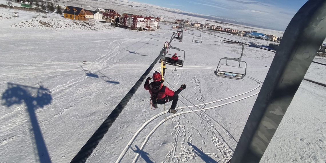Sarıkamış ilçesinde 2 bin 200 rakımlı Cıbıltepe Kayak Merkezi’nde, teleferik hatlarında arıza durumunda mahsur kalanların kurtarılması amacıyla yapılan tatbikatta, telesiyejde kurtarılmayı bekleyenler için JAK ekipleri harekete geçti. Kış sezonu önceki JAK timleri, telesiyej tellerine tırmanarak, halatla mahsur kalan 3 kişiye ulaştı. Görevliler tarafından mahsur kaldıkları yerden alınanlar, halatlarla indirildi.