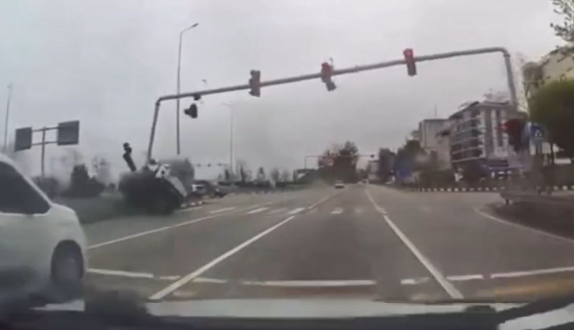 Giresun’un Bulancak ilçesinde Karadeniz Sahil Yolu’nda kontrolden çıkıp sinyalizasyon direğine çarparak devrilen kamyonetteki 4 kişi yaralandı. Kaza anı yoldan geçen bir otomobilin araç kamerasına yansıdı.