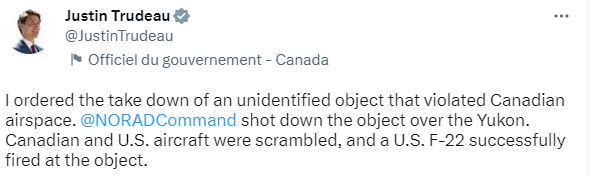 Kanada Başbakanı Truedau, sosyal medya hesabından yaptığı paylaşımda, “Kanada hava sahasını ihlal eden tanımlanamayan bir cismin vurulması emrini verdim. Kuzey Amerika Havacılık Savunma Komutanlığı (NORAD), Yukon’un üzerindeki objeyi vurdu. Kanada ve ABD uçakları havalandı ve bir ABD F-22’si objeyi başarıyla vurdu. Başkan Biden ile konuştum. Kanada Kuvvetleri şimdi nesnenin enkazını kaldıracak ve analiz edecek. Kuzey Amerika’yı izlemeye devam ettiğiniz için NORAD’a teşekkür ederiz” dedi.