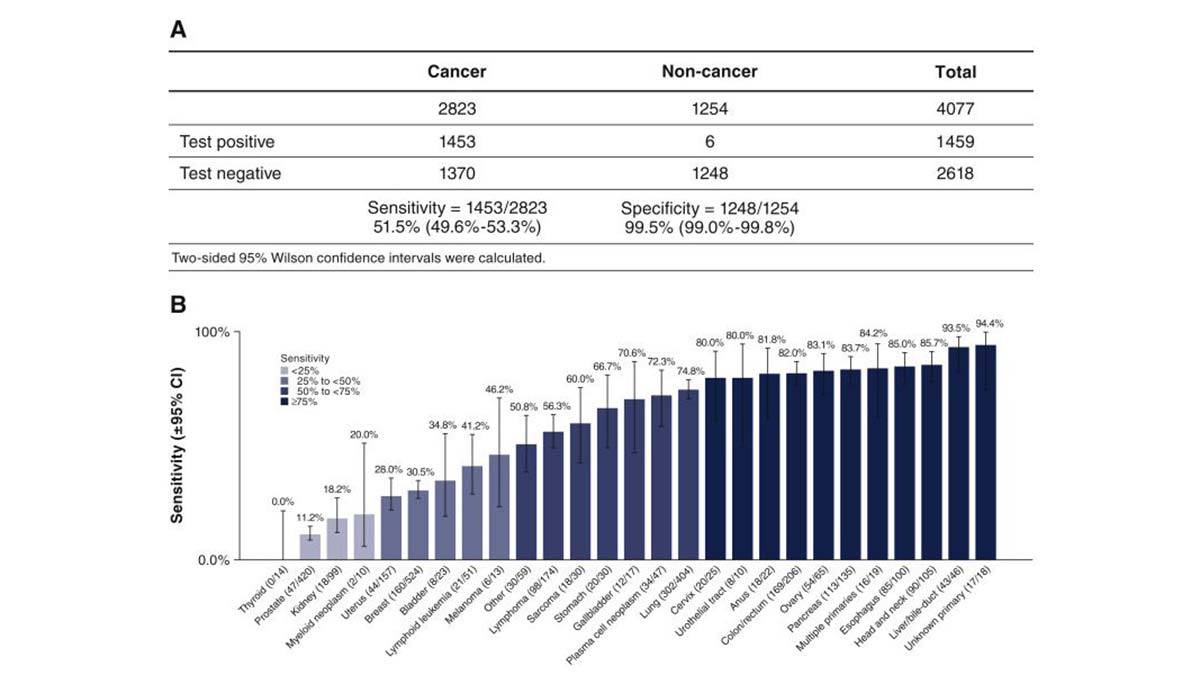 Analiz çalışmasında, 2 bin 823 kanser hastası ve 1254 kanser olmayan toplamda 4 bin 77 kişinin testi incelendi. MCED testinin özgüllük, duyarlılık ve tahmin doğruluğu ölçüldü. Özgüllük değerinde test, kanser sinyali tespiti için yüzde 99.5 sonuç verdi. Testin kanser sinyali tespiti için genel duyarlılık değerinin yüzde 51.5 olduğu ve kanser aşamaları yükseldikçe duyarlılığın arttığı ifade edildi. MCED testinin, kanser hastalarında genel doğruluğunun yüzde 88.7 olduğu belirtildi.