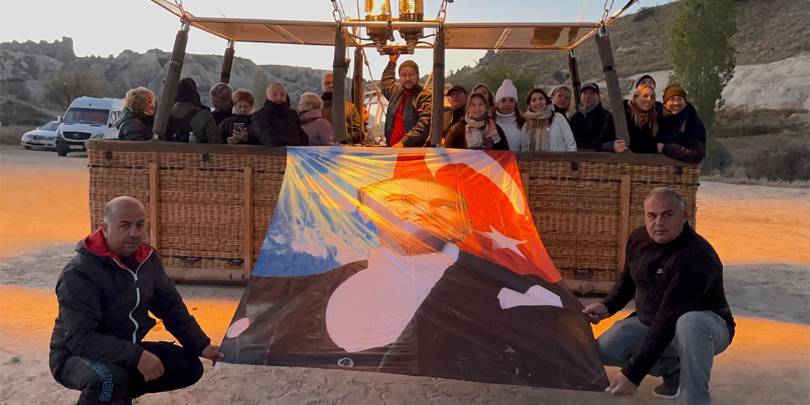 Nevşehir’de turizmciler, Cumhuriyet Bayramı nedeniyle sıcak hava balonlarını Türk bayraklarıyla süsledi. Balonların sepetlerine Türk bayraklarının yanında Mustafa Kemal Atatürk’ün posterleri ile fotoğrafları da asıldı. Bayraklarla süslü balonlar, peribacaları, tüf kayalara oyulu mekanlar ve yer altı şehirleri ile ünlü turizm merkezi Kapadokya semalarında eşsiz görüntüler oluşturdu. Tura katılanlar, 29 Ekim Cumhuriyet Bayramı’nı Kapadokya semalarında uçarak kutladı.