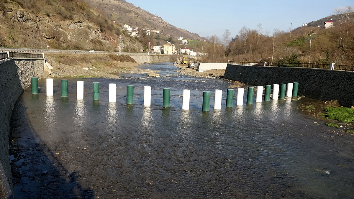 Karadeniz Bölgesi’nde taşkınların önüne geçilebilmesi için 23 noktaya uygulanan, alt kısmı kum ve çakıl gibi rüsubatı tutan, üst kısmı ise ağaç, kök, dal gibi yüzücü odunsu nesneleri tuzaklayan yarı geçirgen tersip bendi dere yataklarının tıkanmasını ve taşkınları önledi.