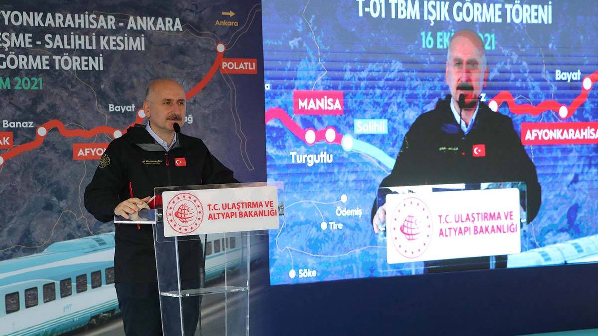 Ulaştırma ve Altyapı Bakanı Adil Karaismailoğlu, Uşak’ın Eşme ilçesinde Ankara-İzmir Demiryolu Hızlı Tren Projesi’nin Eşme- Salihli kesiminde T01 Tüneli’nin Işık Görme Töreni’ne katıldı. Bakan Karaismailoğlu, “Tüneli 206 gün gibi kısa bir sürede tamamlayıp, dünyada kırılması zor bir rekora imza attık. Bu tünel inşaatıyla, dünyaya Türk müteahhitlik sektörünün, Türk mühendislerinin ve çalışanlarının zorlu şartlar altında ne kadar başarılı olabileceklerini gösterdik” dedi.