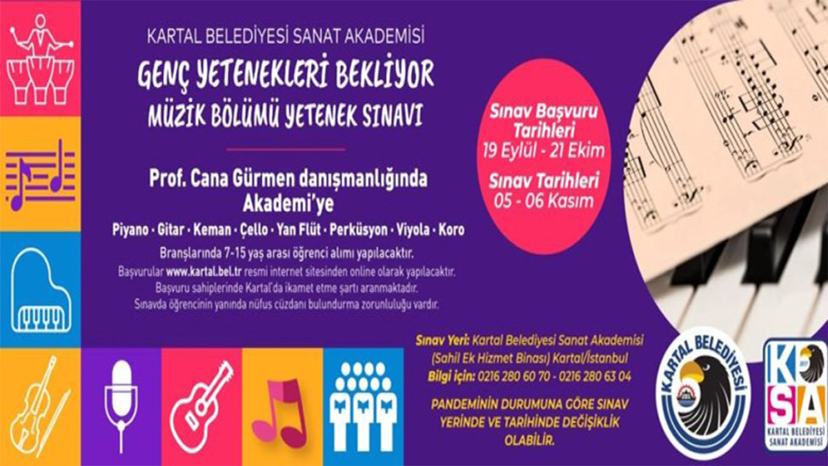 Çocukların ve gençlerin yeteneklerine katkı sağlamak amacıyla Kartal Belediyesi Sanat Akademisi, ‘Müzik Bölümü’nde eğitim almak isteyen 7-15 yaş aralığındaki çocuk ve gençler için yetenek sınavı düzenliyor.