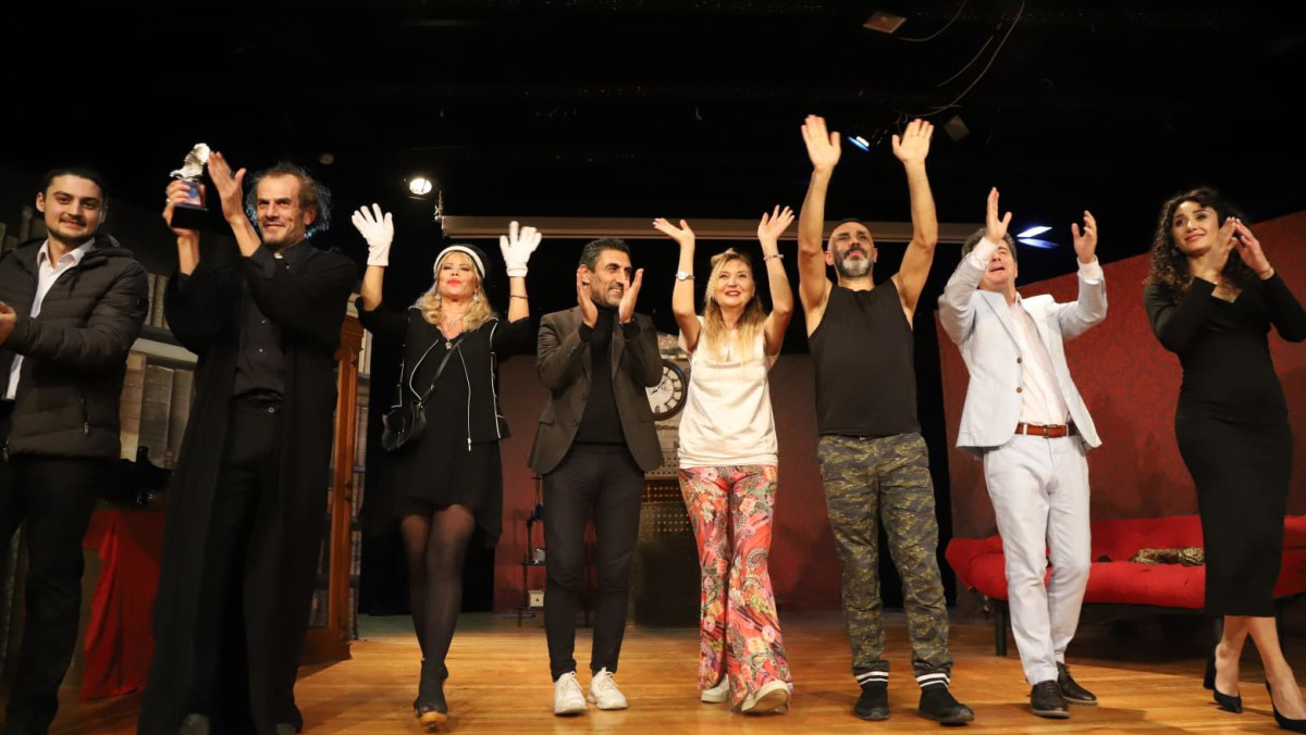 Oyunun ardından sahneye davet edilen Kartal Belediyesi Kültür ve Sosyal İşler Müdürü Umut Veli Develi oyunculara plaket takdim etti.