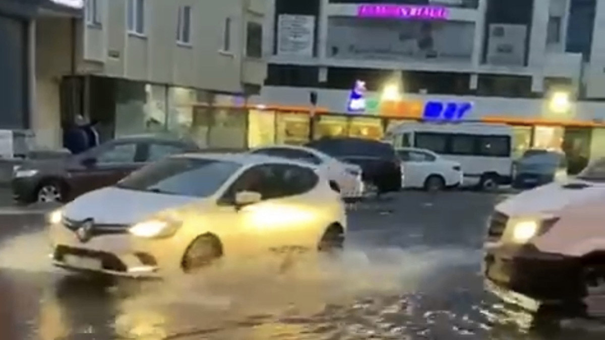 Kartal’da İSKİ’ye ait rögardan taşan sular caddeyi göle çevirirken o anlar güvenlik kamerasına yansıdı.