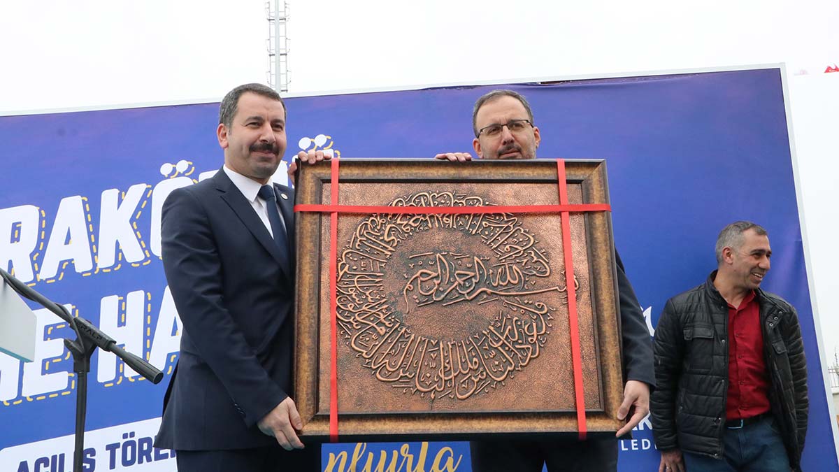 Bakan Kasapoğlu kürsüde konuşurken, havanın rüzgarlı oluşu nedeniyle, üzerine bayrak, flama, ses sitemleri ve fonun uçmaması için de belediye görevlileri önlem aldı.