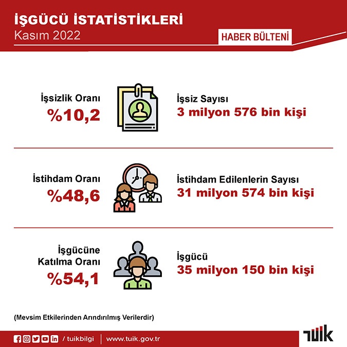 TÜİK, Kasım 2022 iş gücü istatistiklerini açıkladı. Buna göre; 15 ve daha yukarı yaştaki kişilerde işsiz sayısı bir önceki aya göre 23 bin kişi artarak 3 milyon 576 bin kişi oldu. İşsizlik oranı ise değişim göstermeyip yüzde 10,2 seviyesinde gerçekleşti. İşsizlik oranı erkeklerde yüzde 8,8 iken kadınlarda yüzde 12,9 olarak tahmin edildi. İstihdam edilenlerin sayısı bir önceki aya göre 285 bin kişi artarak 31 milyon 574 bin kişi, istihdam oranı ise 0,4 puanlık artış ile yüzde 48,6 oldu.