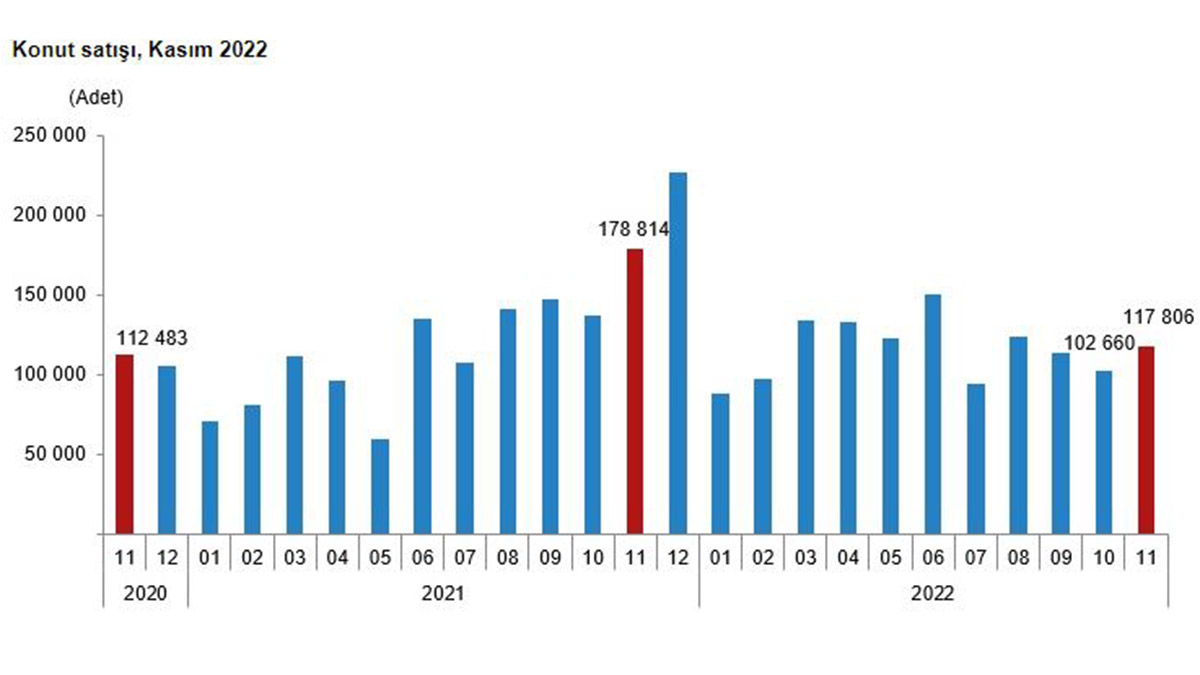 TÜİK, Kasım 2022’ye ilişkin konut satış istatistiklerini açıkladı. Buna göre; Türkiye genelinde konut satışları, bir önceki yılın aynı ayına göre yüzde 34,1 azalarak 117 bin 806 oldu. Konut satışlarında İstanbul, 19 bin 687 konut satışı ve yüzde 16,7 oran ile en yüksek paya sahip oldu.