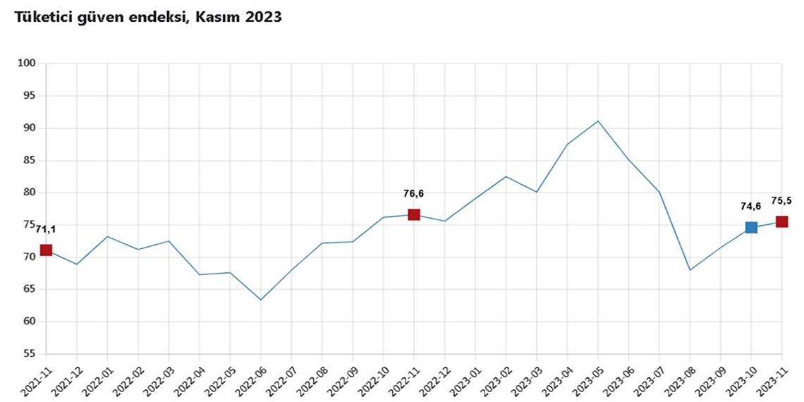 TÜİK, Kasım 2023 dönemine ilişkin tüketici güven endeksi verilerini açıkladı. Buna göre; Türkiye Cumhuriyet Merkez Bankası iş birliği ile yürütülen tüketici eğilim anketi sonuçlarından hesaplanan tüketici güven endeksi, kasım ayında yüzde 1,1 oranında artarak 75,5 oldu.