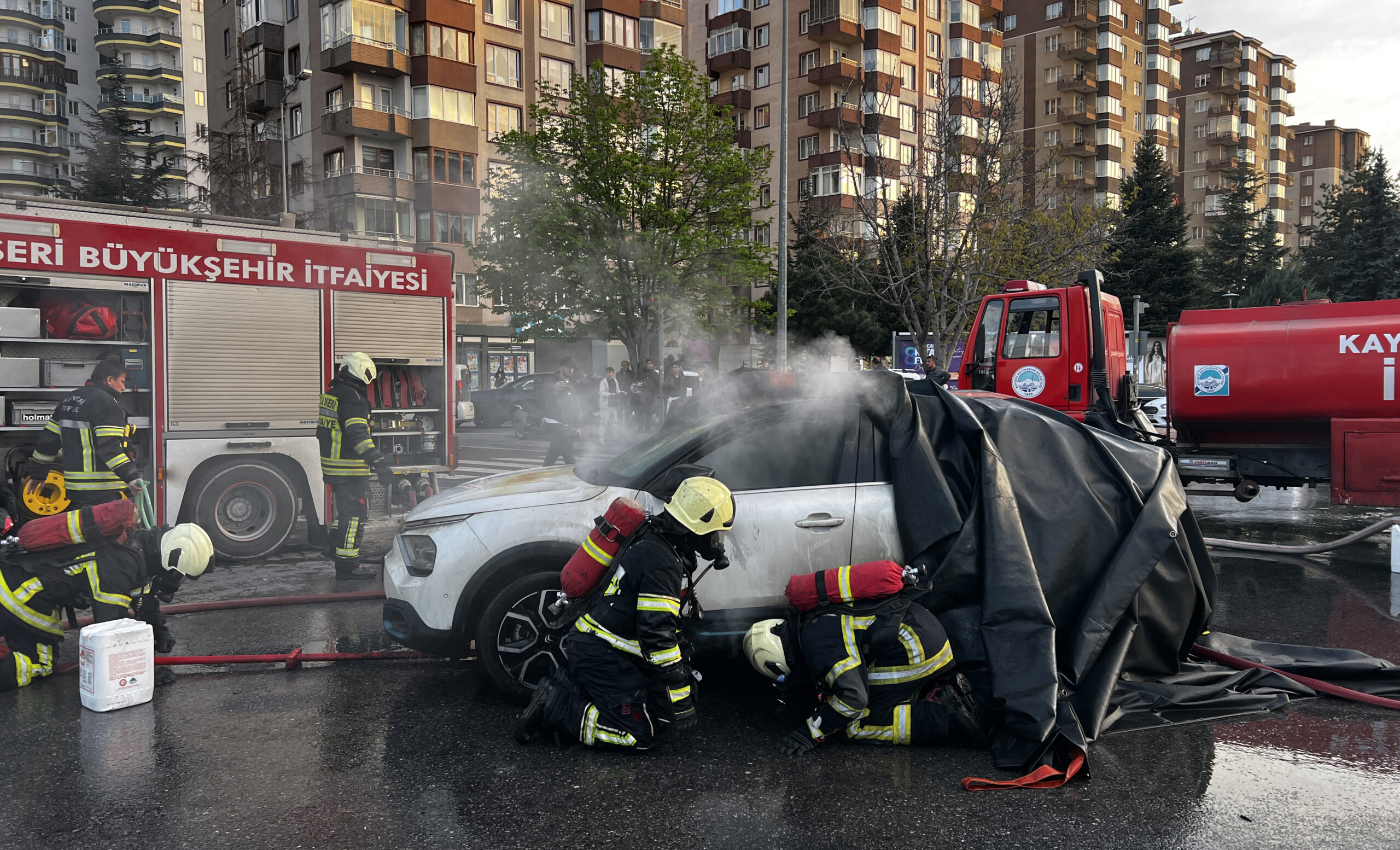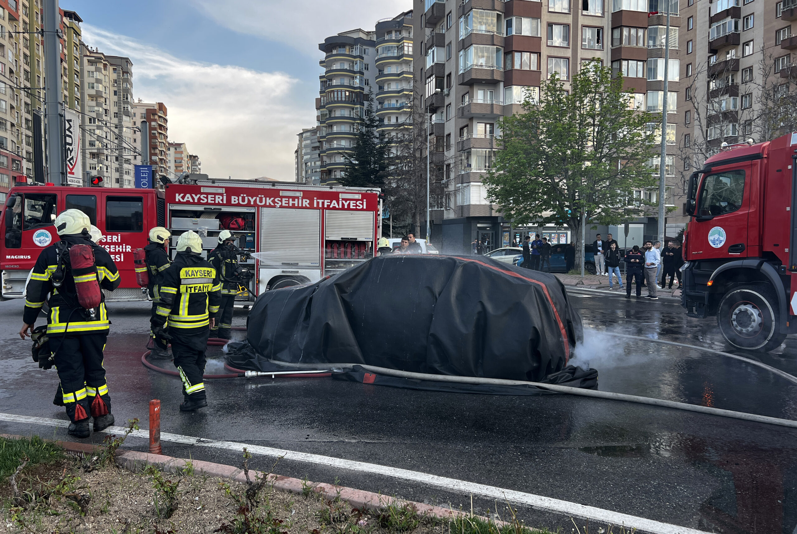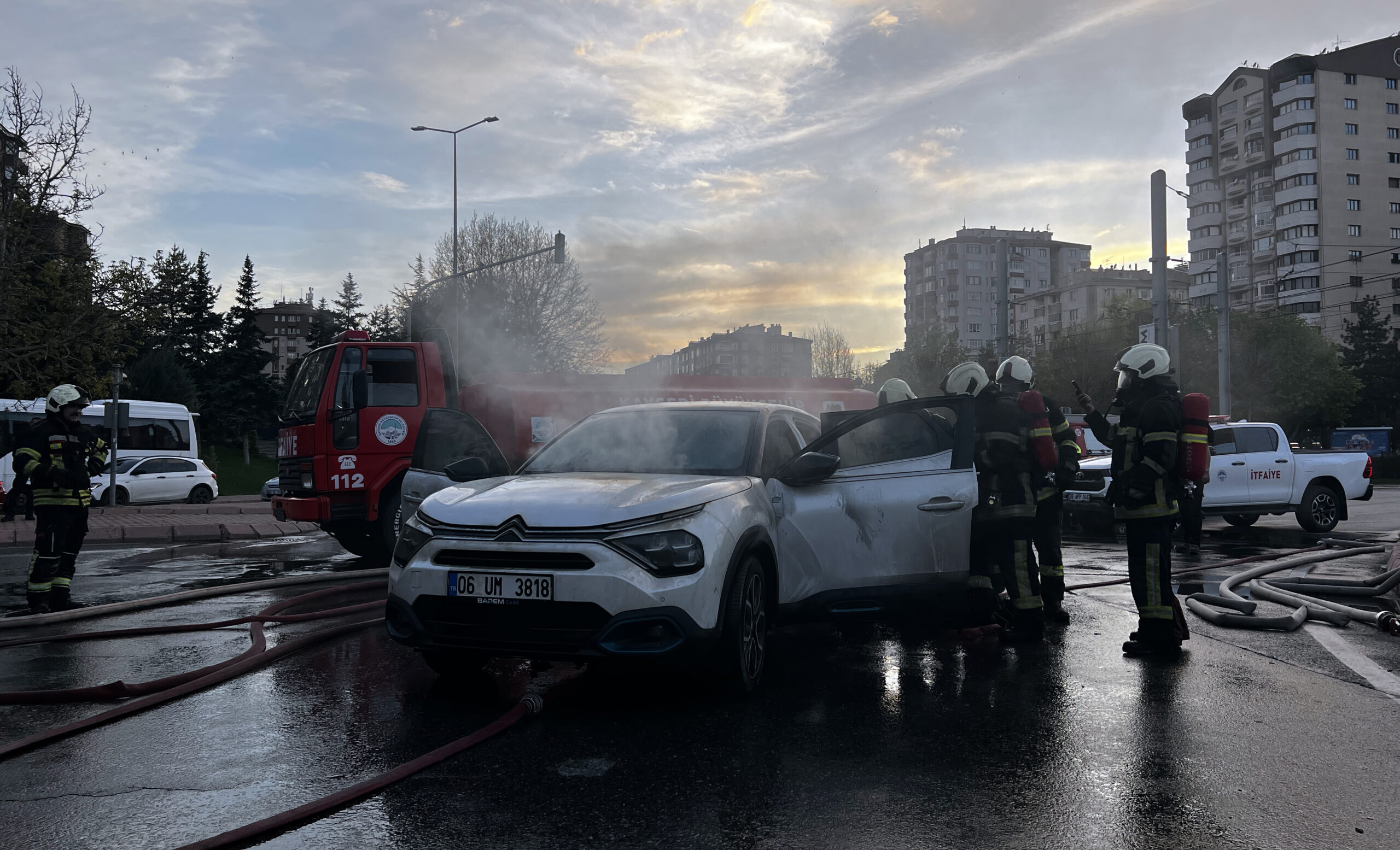 Melikgazi ilçesi Alparslan Mahallesi Sivas Bulvarı'nda saat 18.00 sıralarında, Z.K. idaresindeki 06 Um 3818 plakalı elektrikli otomobil, seyir halindeyken alev aldı. İhbar üzerine bölgeye itfaiye ve polis ekipleri sevk edildi. İtfaiye ekipleri, alevler içindeki elektrikli otomobilin üzerine yangın battaniyesi örterek, altından su ile müdahale etti. Ekiplerin yaklaşık 1 saatlik çalışmasıyla otomobildeki yangın söndürüldü.