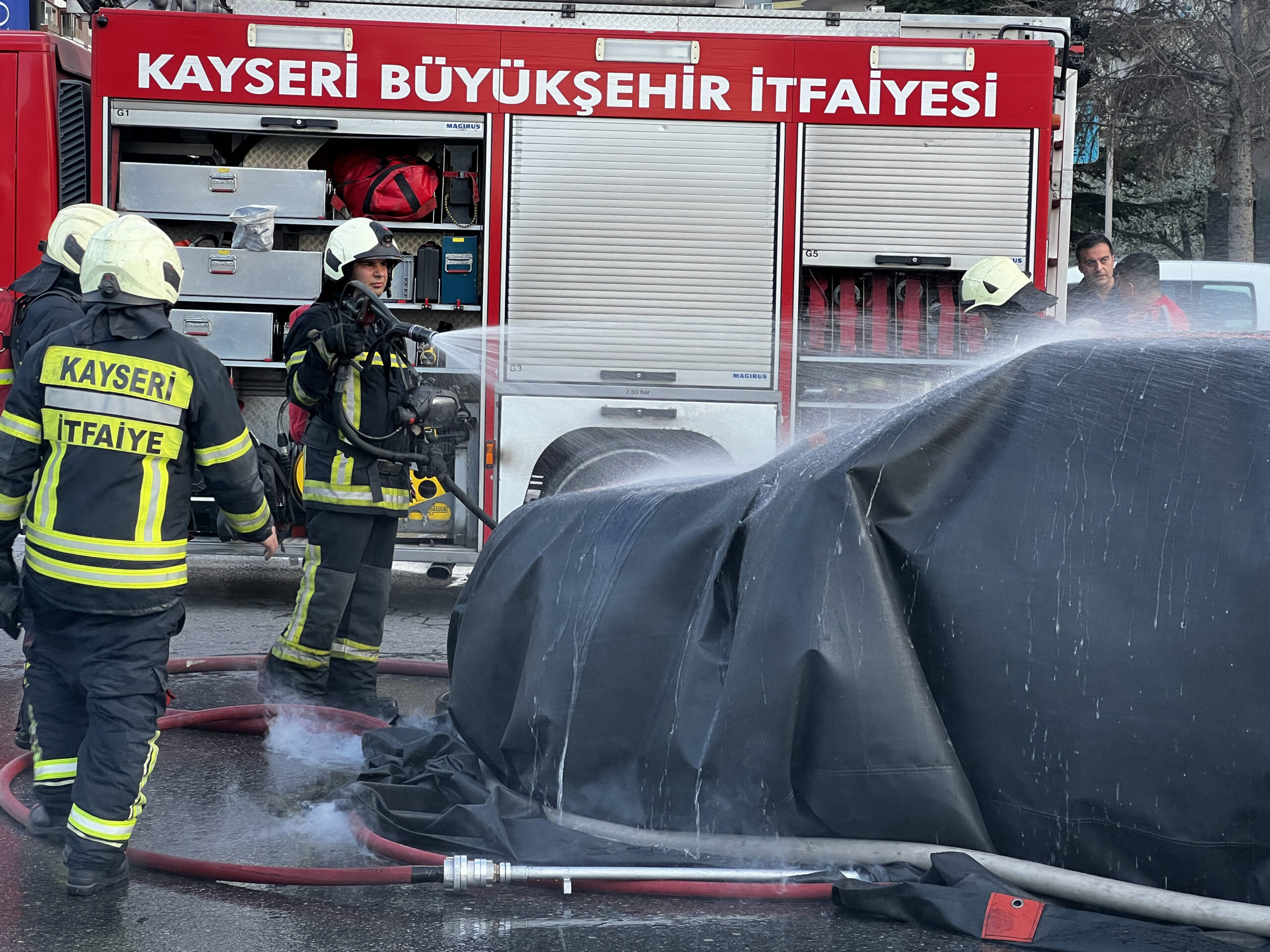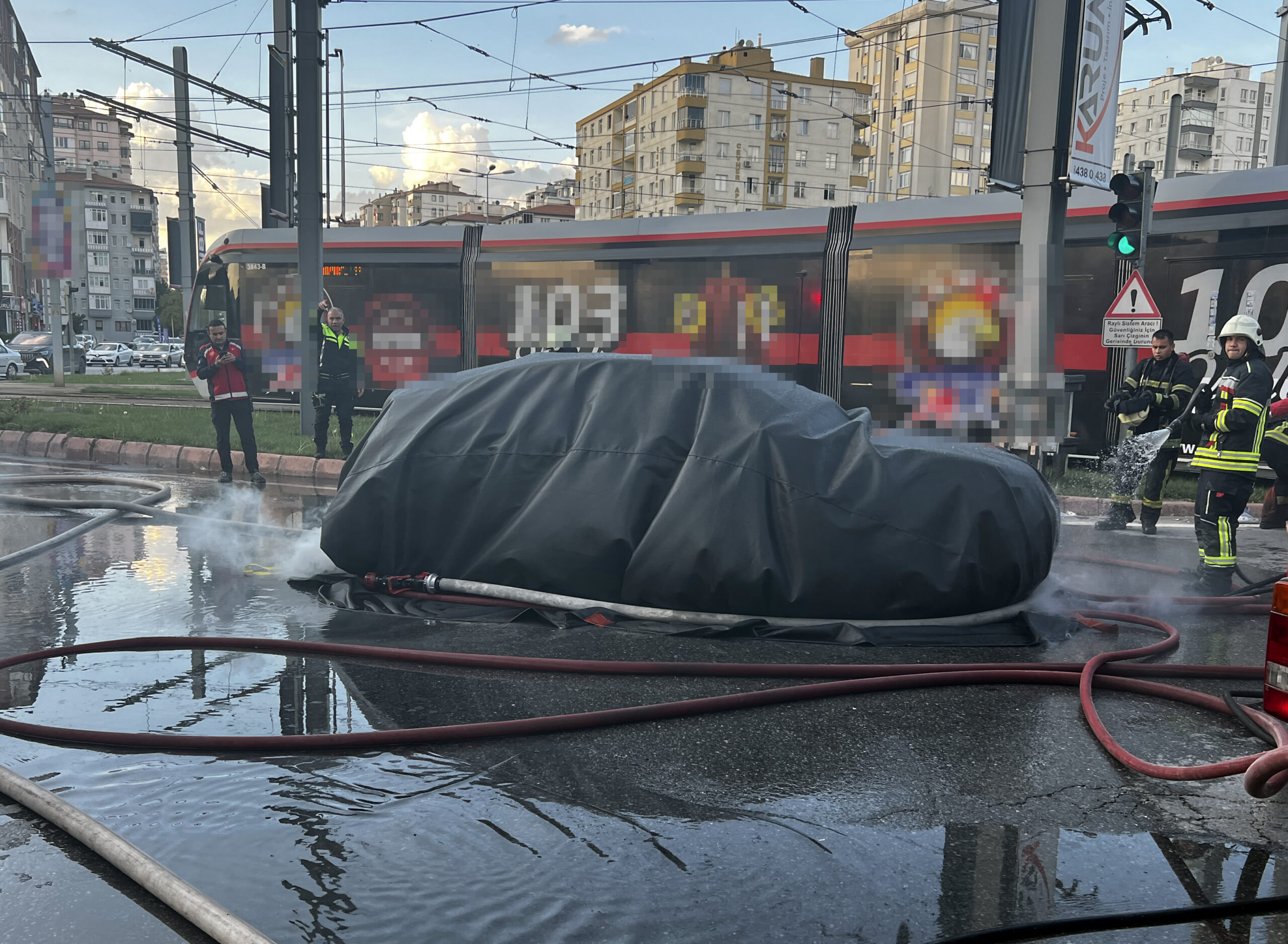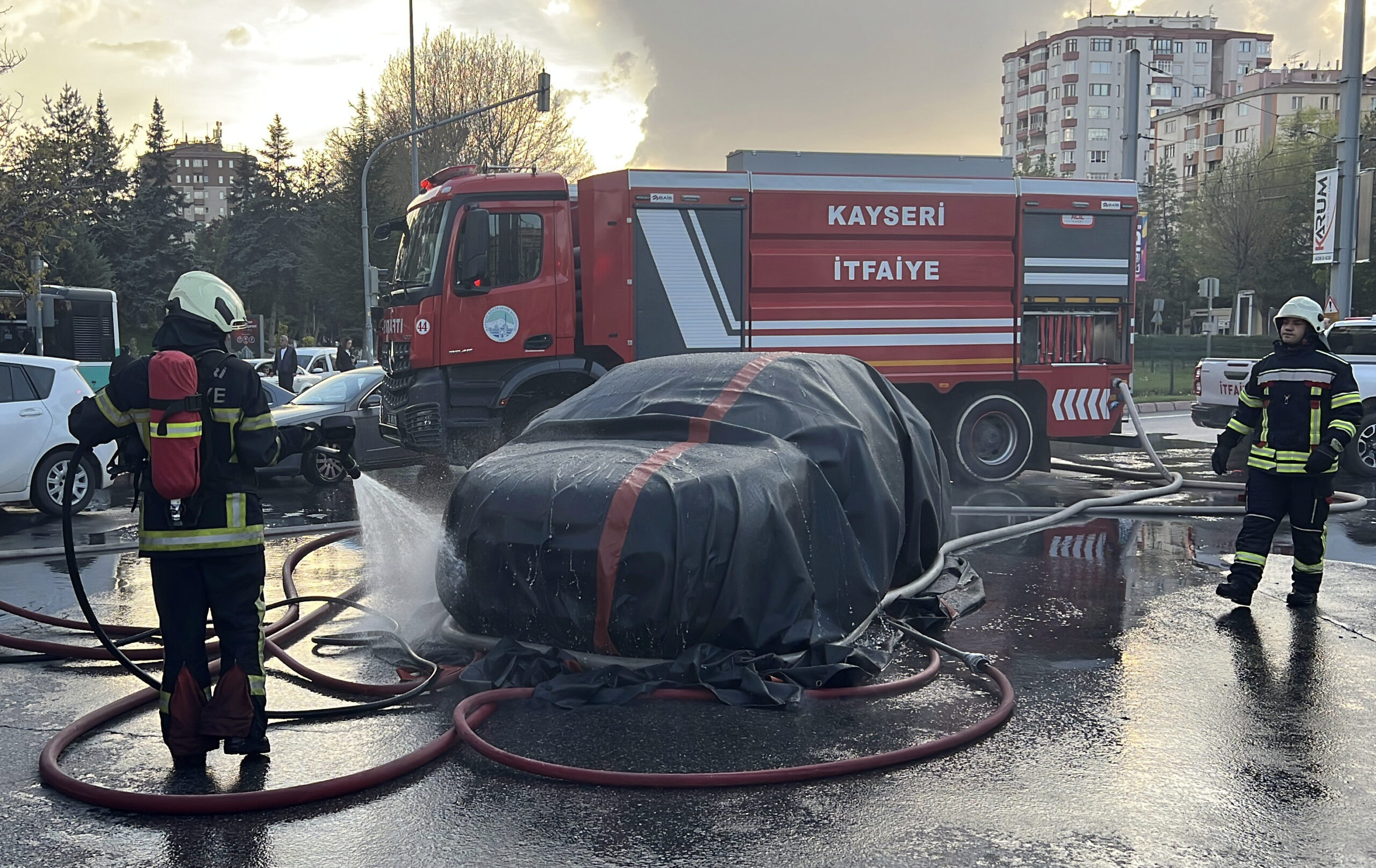 Melikgazi ilçesi Alparslan Mahallesi Sivas Bulvarı'nda saat 18.00 sıralarında, Z.K. idaresindeki 06 Um 3818 plakalı elektrikli otomobil, seyir halindeyken alev aldı. İhbar üzerine bölgeye itfaiye ve polis ekipleri sevk edildi. İtfaiye ekipleri, alevler içindeki elektrikli otomobilin üzerine yangın battaniyesi örterek, altından su ile müdahale etti. Ekiplerin yaklaşık 1 saatlik çalışmasıyla otomobildeki yangın söndürüldü.