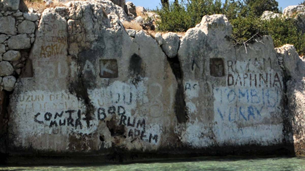 Antalya’nın Demre ilçesindeki dünyaca ünlü Kekova’da Tersane Koyu’ndaki tarihi kalıntılara kimi ilan yapıştırdı, kimileri ise yağlı boya ile firma ve tur teknesi adını, telefonunu, kimi de sevgilisinin adını yazdı. Duruma tepki gösteren Üçağız Mahalle Muhtarı Durali Aliçavuşoğlu, tarihi kalıntıların üzerindeki yazıların silinmesini istedi.
