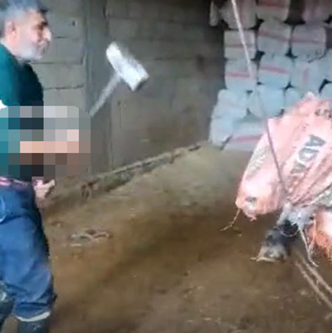Kızıltepe’de bir kişi, ahırda kesimini yapacağı gözlerini bağladığı boğayı başına defalarca balyoz vurup, öldürdü. Görüntüler ortaya çıkınca, sosyal medyada büyük tepki çekti. Harekete geçen polis, görüntülerin kırsal Hocaköy Mahallesi’nde çekildiğini tespit etti.