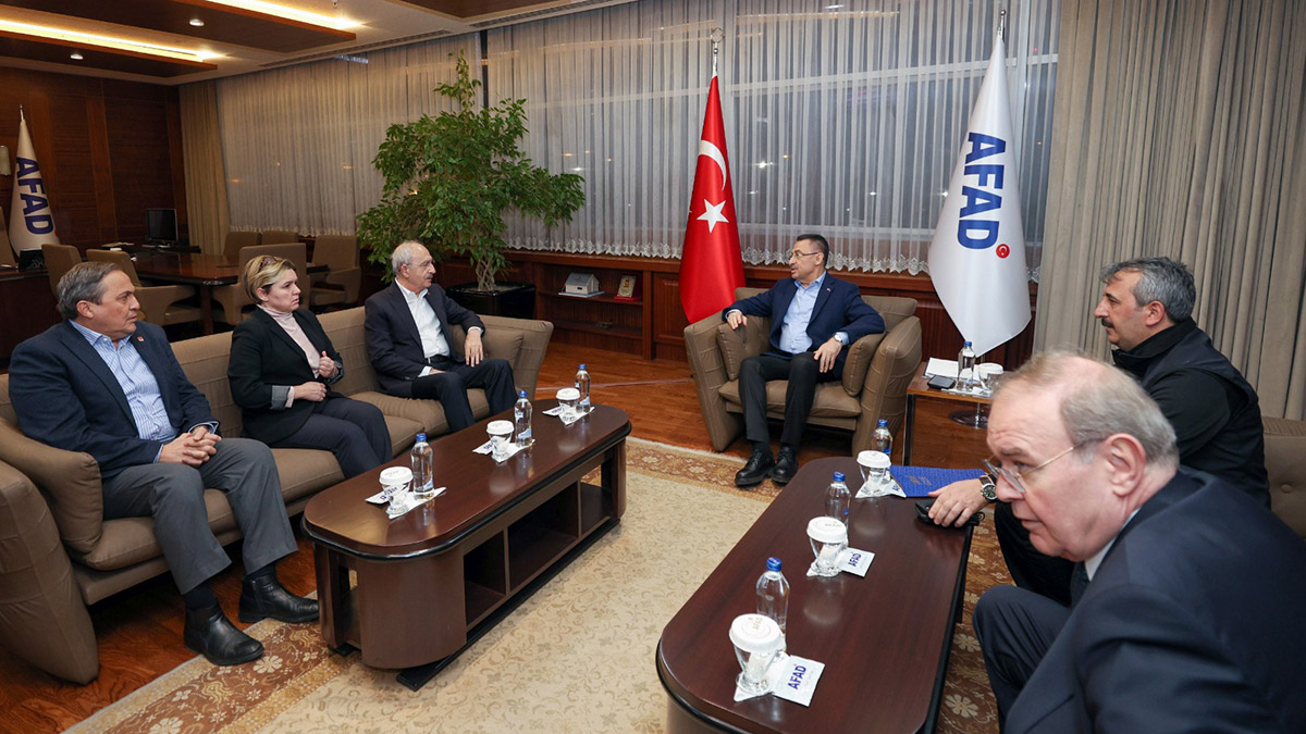 CHP Genel Başkanı Kemal Kılıçdaroğlu, Genel Başkan Yardımcıları Selin Sayek Böke, Faik Öztrak ve Seyit Torun ile beraber AFAD’a geldi. Kılıçdaroğlu, Cumhurbaşkanı Yardımcısı Fuat Oktay ve AFAD Başkanı Vali Yunus Sezer ile yaklaşık 40 dakika süren bir görüşme gerçekleştirdi. Kılıçdaroğlu, görüşmede Kahramanmaraş’ın Pazarcık ve Elbistan ilçelerinde meydana gelen ve birçok ilde yıkıma neden olan 7.7 ve 7.6 büyüklüğündeki depremler hakkında bilgi aldı.